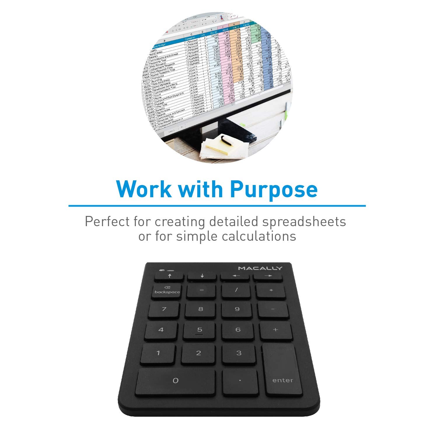 Details: Wireless Numeric Keypad - Macally RFNUMKEY22 The Macally RFNUMKEY22 is a 22 key numeric keypad that is user friendly and easy to connect to your devices. Easy Set-Up 1. Simply turn the power switch to the ON position 2. Plug in USB RF receiver into one of your computer's USB ports 3. Start enjoyng your brand new Macally Wireless Keypad Perfect for Accounting and Math Create your intricate excel spreadsheet or calculate your advanced math problems with the ease of an external keypad Slim&Portable Design Take this portble and easy to carry number pad with you in smaller compartments System requirements: USB ports (2.0 & 3.0); Mac OS X v10.6 or later; Windows 7/8/10(For example, computers such as Dell, HP, Macbook air, pro, Mac, Lenovo, Toshiba, Acer, Asus, compaq etc.) ABOUT MACALLY: For more than 25 years, customers have trusted Macally for all their electronic needs and have been delighted by their lifetime US-based support.