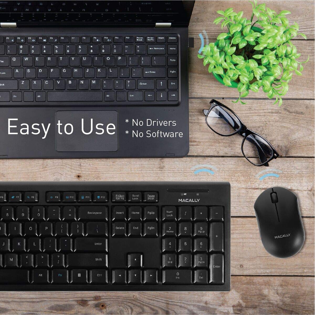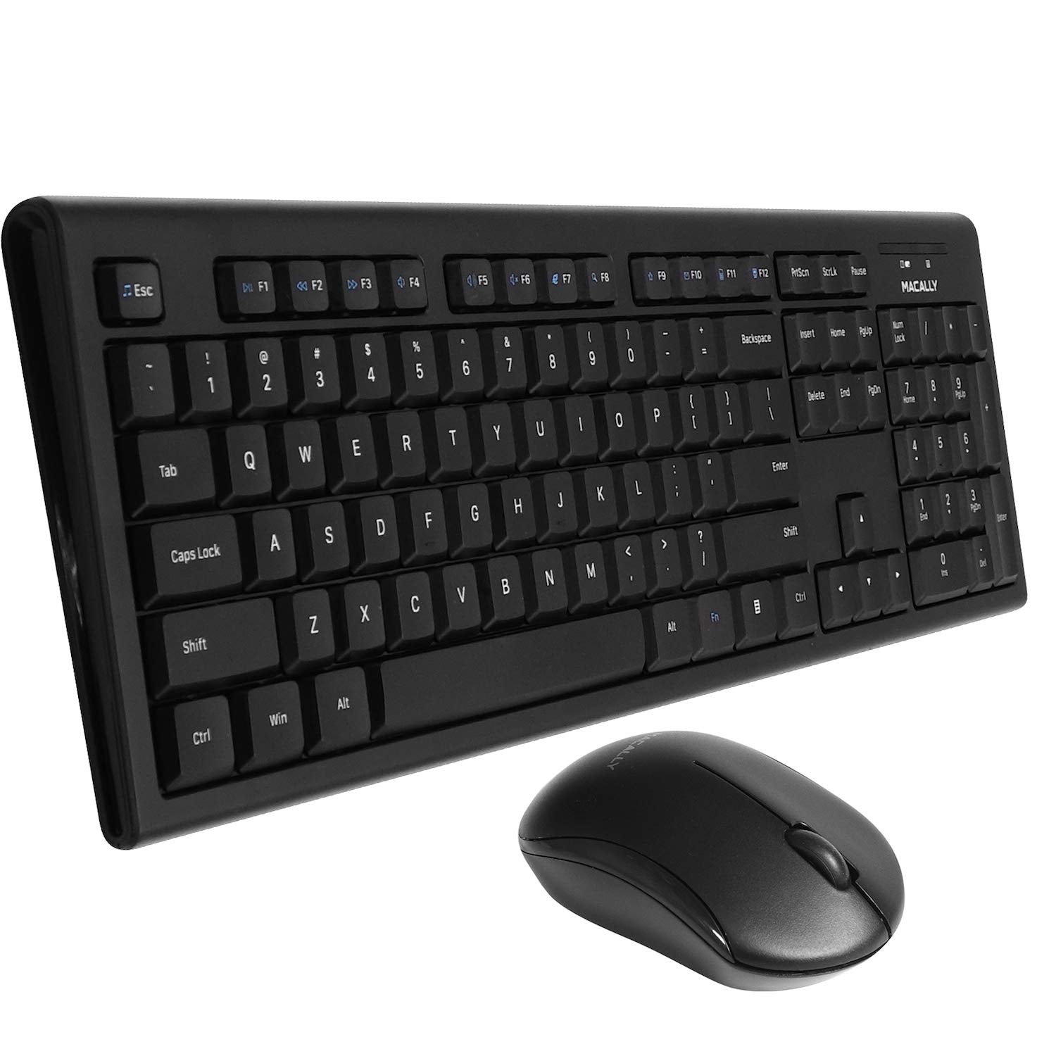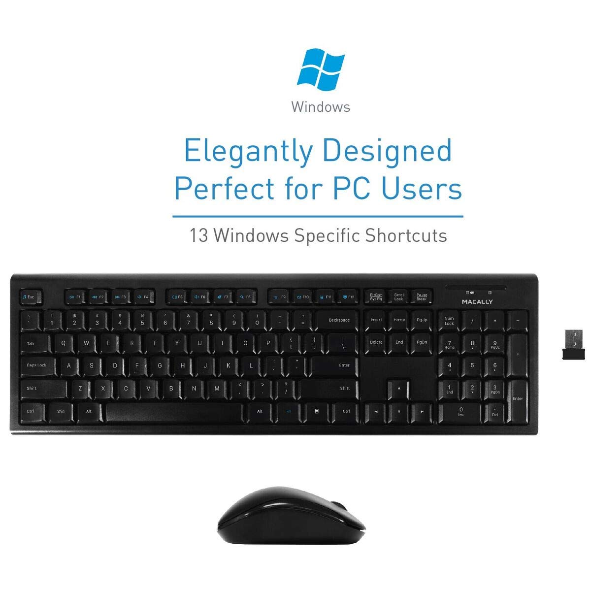 Details: MACALLY RFSSKEYCOMBO | FULL SIZE KEYBOARD with OPTICAL MOUSE BUNDLE, SPECIALLY DESIGNED FOR WINDOWS PC The Macally RFSSKEYCOMBO includes a wireless keyboard with a standard layout and 104 full size, yet thin, keys for a comfortable and efficient typing experience. The additional shortcut keys and numeric keyboard further increase efficiency and productivity. ELEGANTLY ENGINEERED TO MIX ERGONOMICS and STYLE At only 0.79mm in height, the thin, compact design makes the RFSSKEY MORE VERSATILE than ever for various occasions and usages. Not to mention, the sleek and stylish frame/body that will match your PC devices flawlessly. ULTRA COMFORTABLE RUBBER DOME TYPING The slightly thin and curved keycaps with rubber membrane support, provides immense comfort and enhances your overall typing productivity. Choose between typing with an angled keyboard or flat keyboard with the anti-slip kickstands. EASY TO SETUP (PLUG & PLAY) AND COMPATIBLE WITH ALL WINDOWS The Macally RFSSKEYCOMBO is very easy to use, and no software is required! Simply plug the receiver into the USB port of your computer, and you are ready to go! Unlike wireless keyboards, this keyboard doesn't need charging not syncing. KEYBOARD SPECS 104 Full-Size Keyboard 13 Convenient Shortcuts for Windows Integrated 10 Number Keypad Dimensions: 5.4"" x 17.5"" x 0.78"" Weight: 1 (lb) MOUSE SPECS 3 Button (scroll wheel, left / right click) 1200 DPI 1000 Hz polling rate Left or Right Hand (ambidextrous) Compatible for all PC Windows Computer, Laptops, Mac laptop and computer mice (iMac Mouse, MacBook Air Mouse, Apple Mac Pro, and Computer Mouse for MacBook Pro) ABOUT MACALLY For more than 25 years, customers have trusted Macally for all their electronic needs and have been delighted by their US-based support.