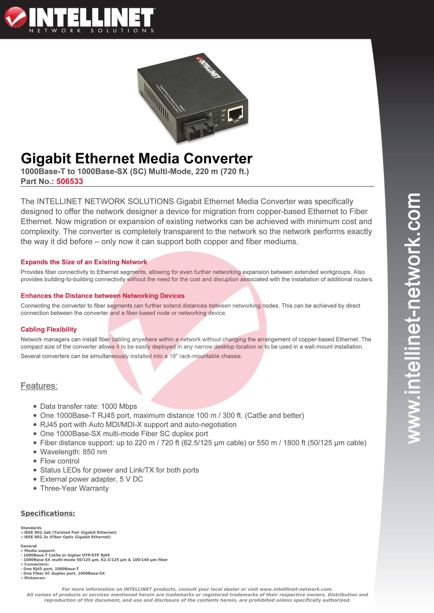 Details: Intellinet Gigabit Multi-mode Sc Media Converter, 720' - Enhance Your Existing Network So It Supports Both Copper And Fiber Mediumns.