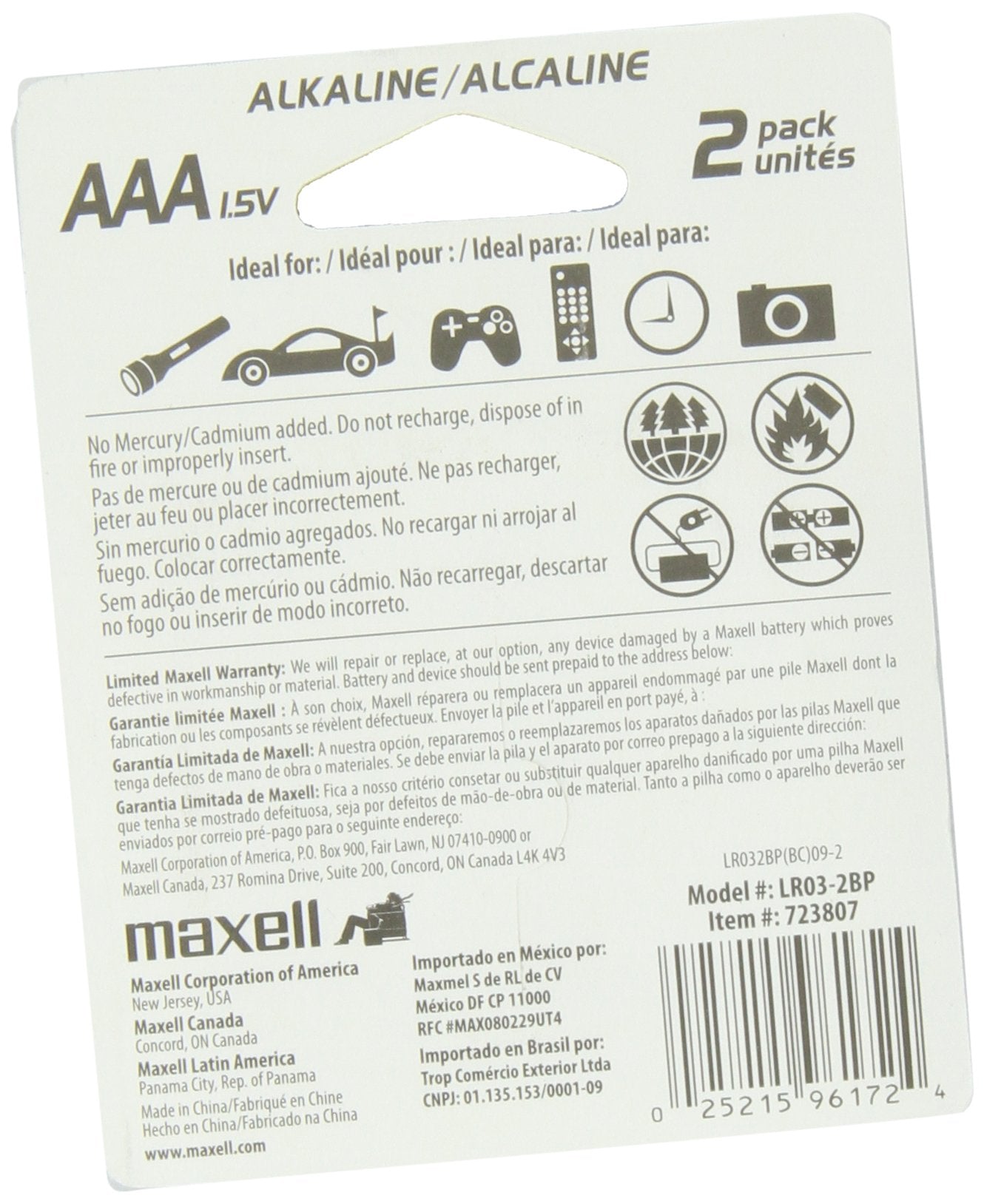 Maxell 723807 LR03 2BP AAA Cell 2-Pack Carded Battery