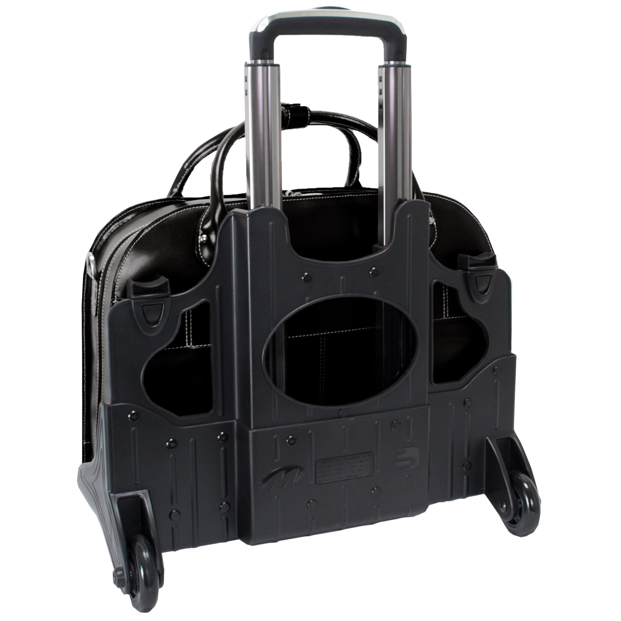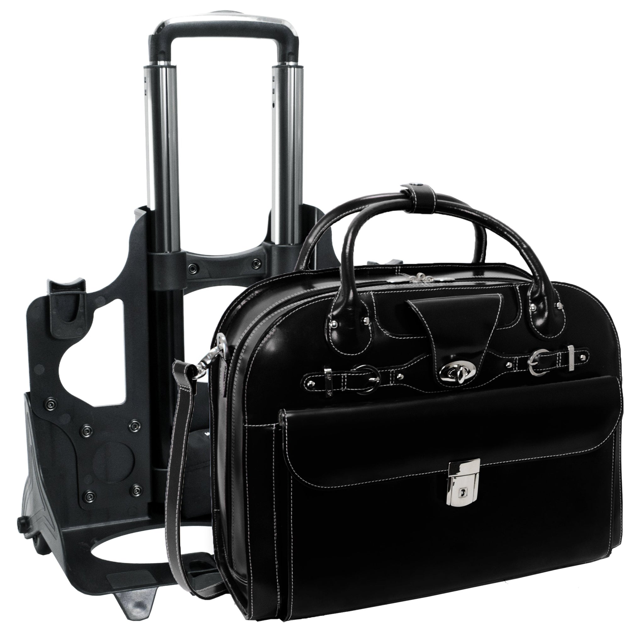 Details: Includes tablet pocket. Patented 2-in-1 removable wheel and handle system. Removable case. Checkpoint friendly. Weather proof. Laptop protection. Smart strap. Removable padded sleeve that fits laptops up to 15.5 in.. Flap over front pocket with key lock for added security. Small front pocket secured by flap with turn lock. Main compartment divided by secure zipper pocket. Wheel size weight: 4.63. Telescopic handle length: 41 in.. Strap: 16 in. - 18 in.. Lifetime limited warranty. Made in Thailand. Laptop size: 14.5 in. H x 2 in. W x 10 in. H. Device fit: 15.6 in.. Overall: 18 in. L x 8.75 in. W x 14.5 in. H (8.6 lbs.). We recommend using LEXOL-pH as non-alkaline cleanser and Lexol Leather Conditioner and Preservative to maintain strength, beauty, utility and flexibility of McKlein leathers - old and new - and to restore resiliency.