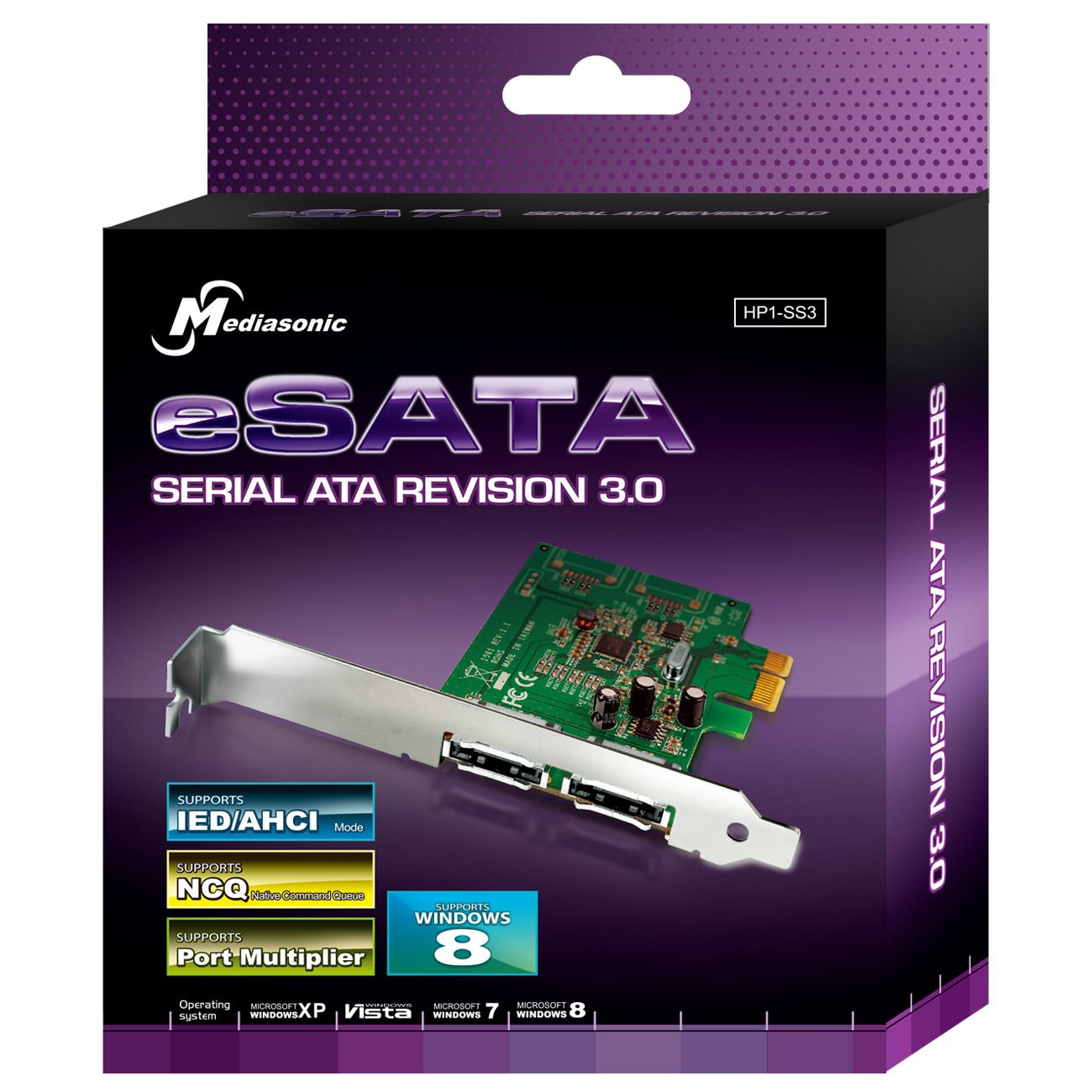 Details: Mediasonic ProBox HP1-SS3 2 Port eSATA PCI express card offer simple connectivity between a computer and eSATA III devices. It fully support SATA 3.0 hard drive and data transfer speed up to 6 Gbp, and offer high performance, reliability, and stability data transfer. This card also support port multiplier capability with command-based and FIS-based switching for multiple hard drive through external SATA connection.