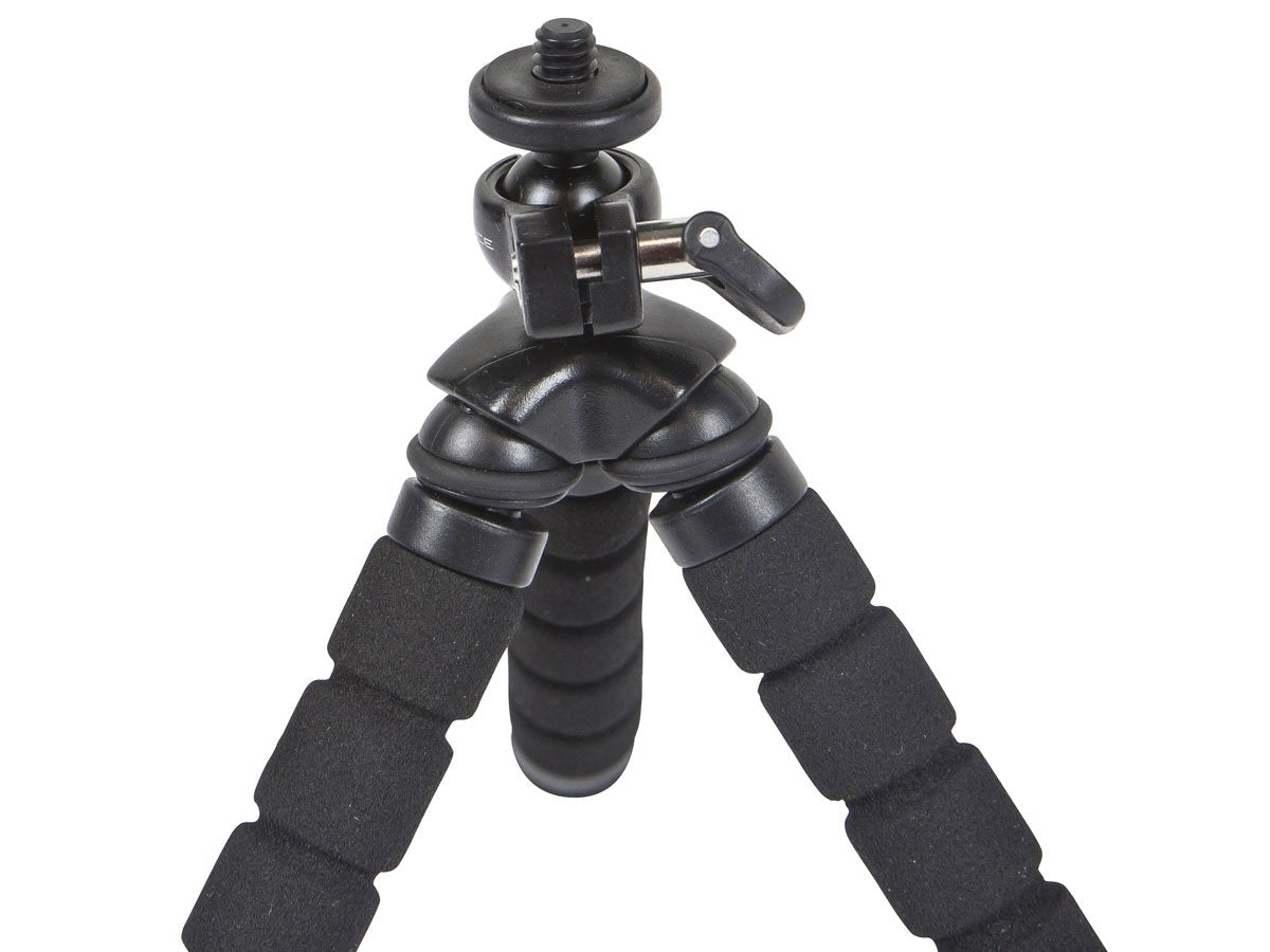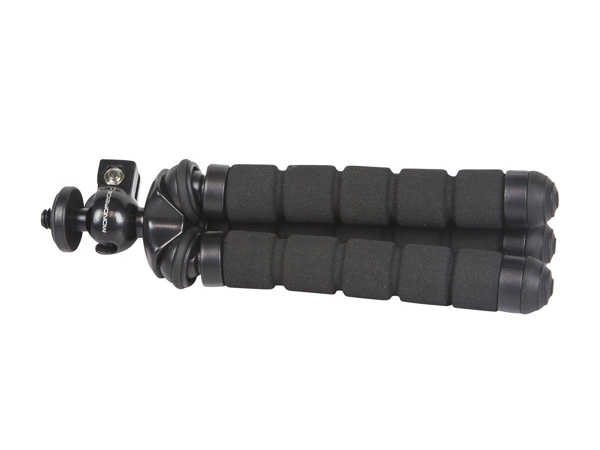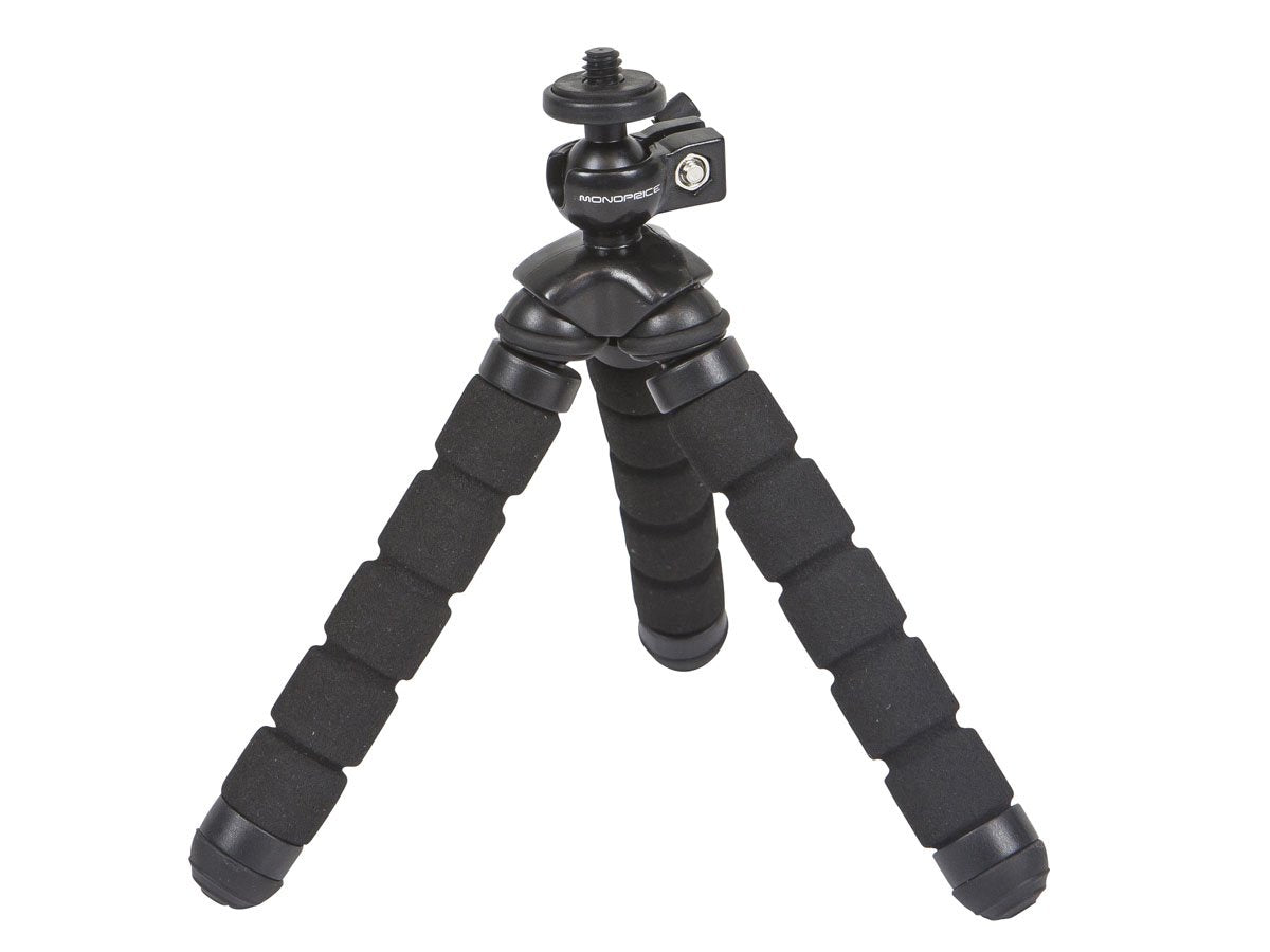 Details: Get the angle just right with this Small Flexible Tripod from Monoprice! This lightweight flexible tripod can be mounted virtually anywhere. The ultra flexible legs allow you to wrap your camera around poles, fences, tree branches, or anywhere else you may need it, so you don't have to leave anything or anyone out of your pictures. The tripod's feet are made of rubber so that it won't slip from any surface it is resting on. The universal mount head has a 360 degree swivel range and can tilt in any direction. It can also easily switched between landscape and portrait mode. When the legs are pointed straight out, the tripod is 5.7" long. It weighs only 1.8 oz and can support up to 9.9 oz.