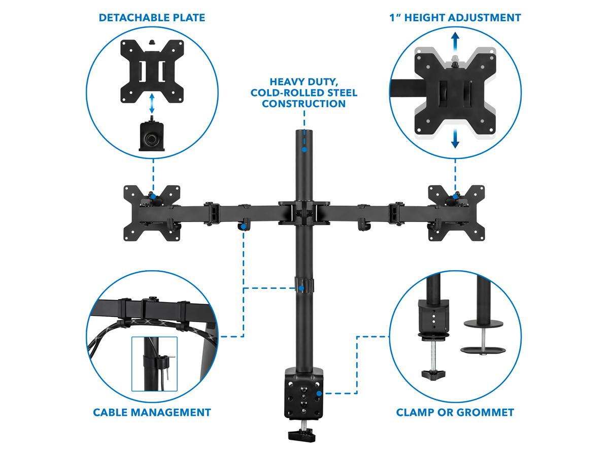 MI-2752 is the ideal for dual desk mounted monitors. The effective design comes at an affordable price. Universal VESA 75x75 and 100x100 pattern compatibility ensures this mount is compatible with all monitors on the market.