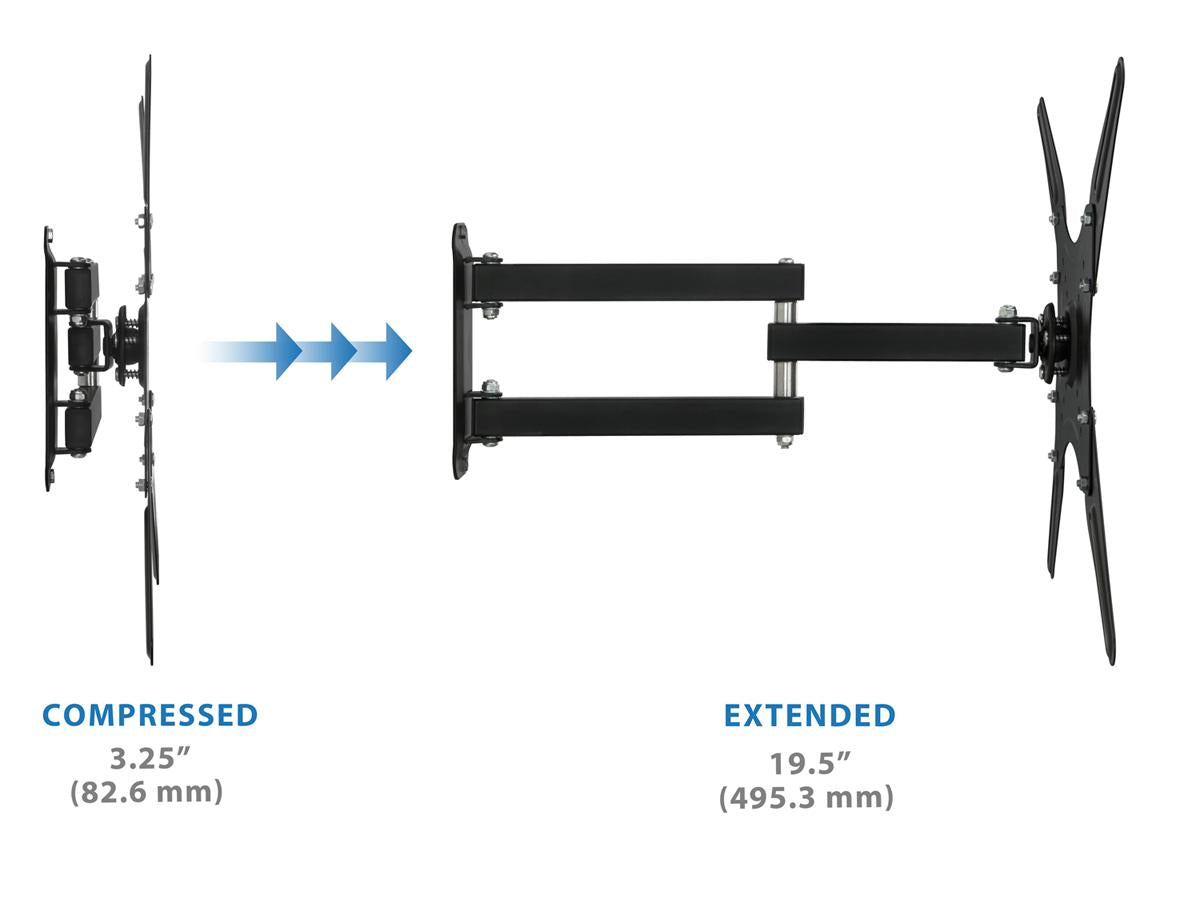 Universal TV wall mounting bracket design fits most of 23-55 LCD/LED/Plasma TVs on the market. TV stays as close as 2.4 from the wall or can extend up to 20 inches. Swivel left or right 180 degrees.