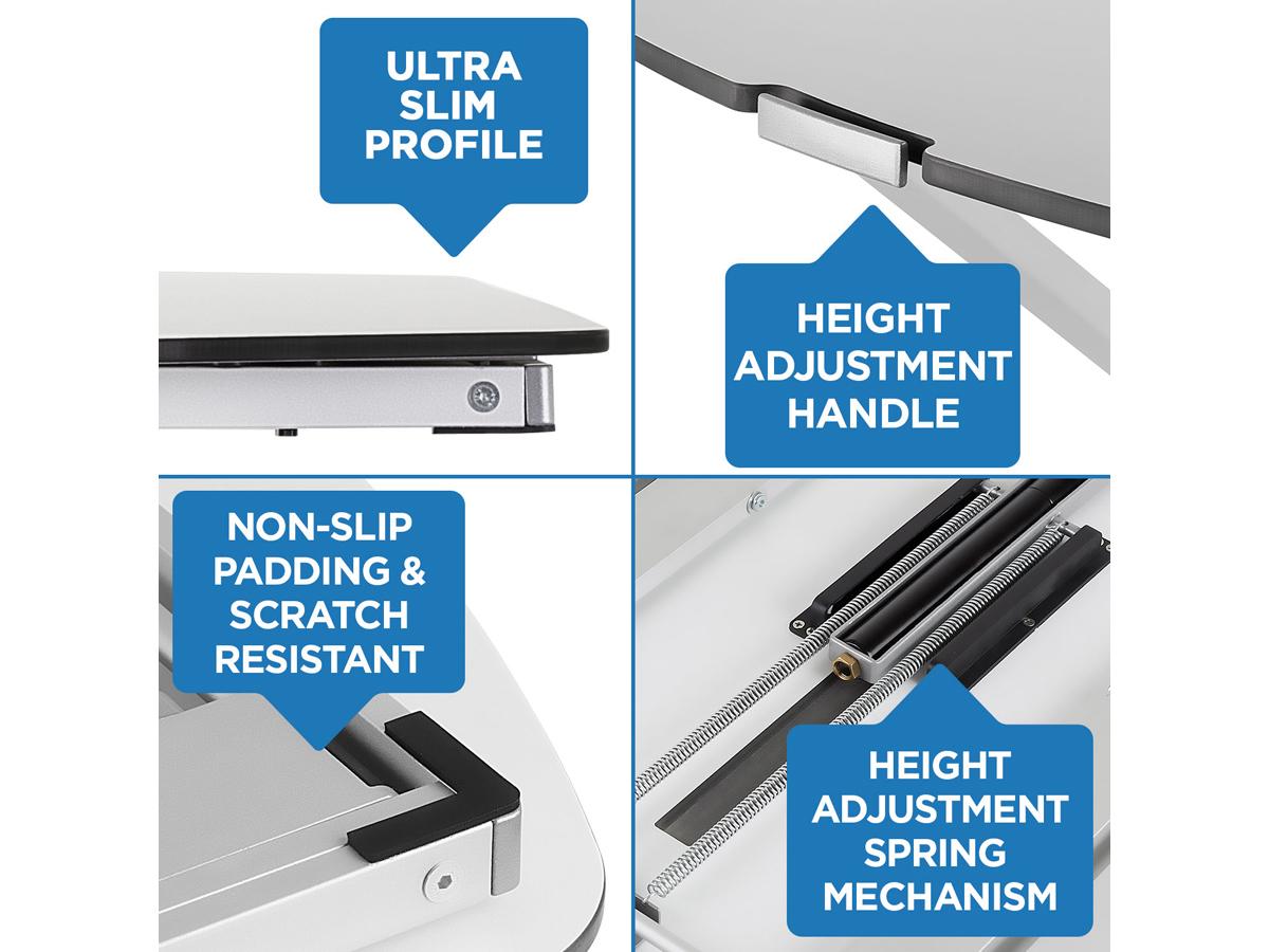 This sit-stand desk helps you set your computer and laptop at multiple height according to your comfort, reducing neck and back strain. It moves from a sitting to standing position with ease in a matter of seconds, with premium gas spring lift.