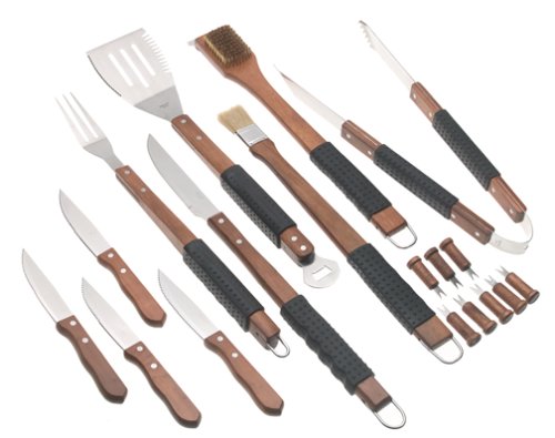 Details: Mr. Bar-B-Q 18-Piece Gourmet Stainless Steel Tool Set with wood handles includes 4-in-1 spatula, tongs, fork, knife, basting brush, grill brush, 8 corn holders, 4 steak knives and plastic case; Stainless steel tools with rubber grip handle; Durable plastic case for carrying and storing tools.