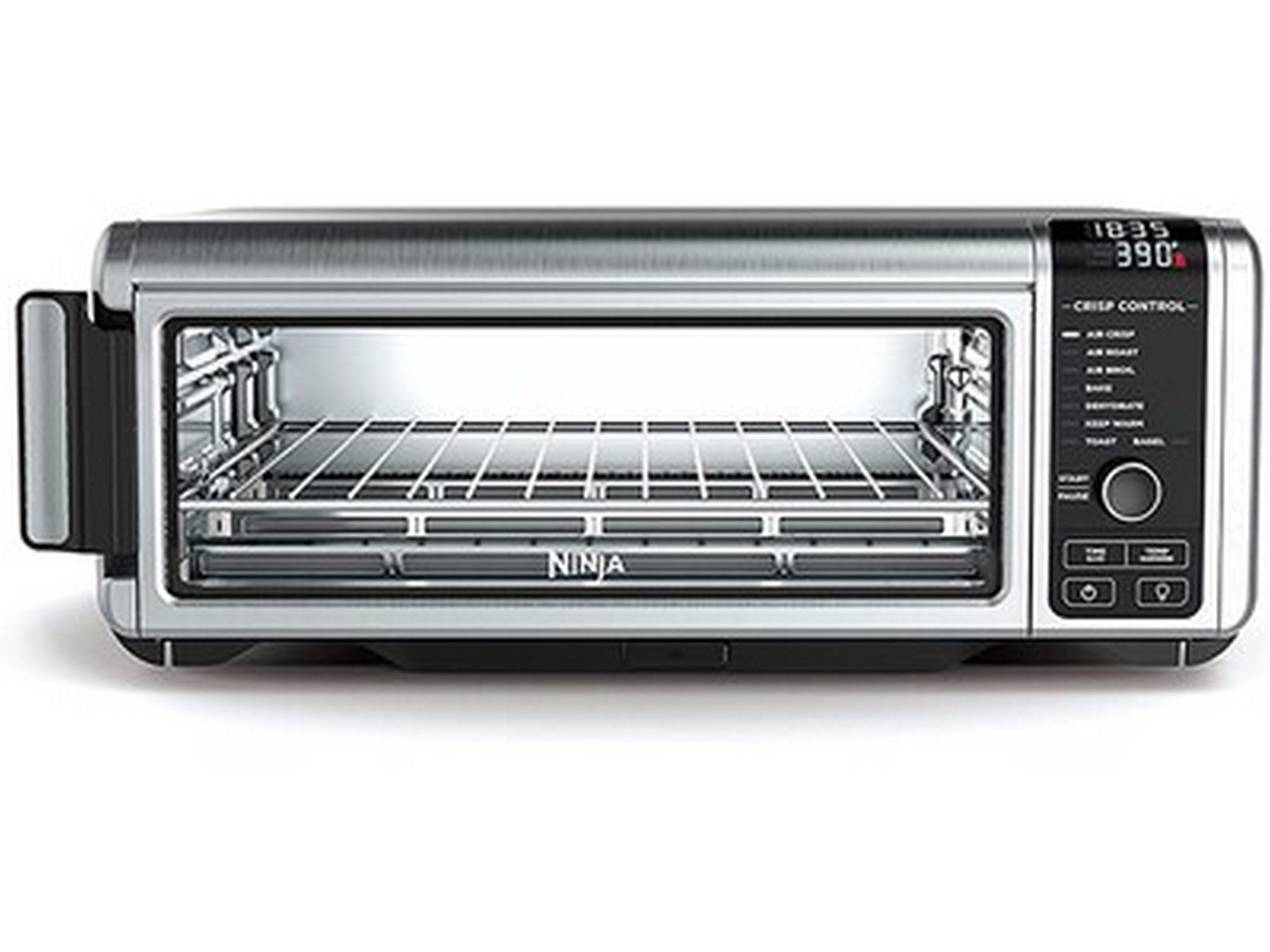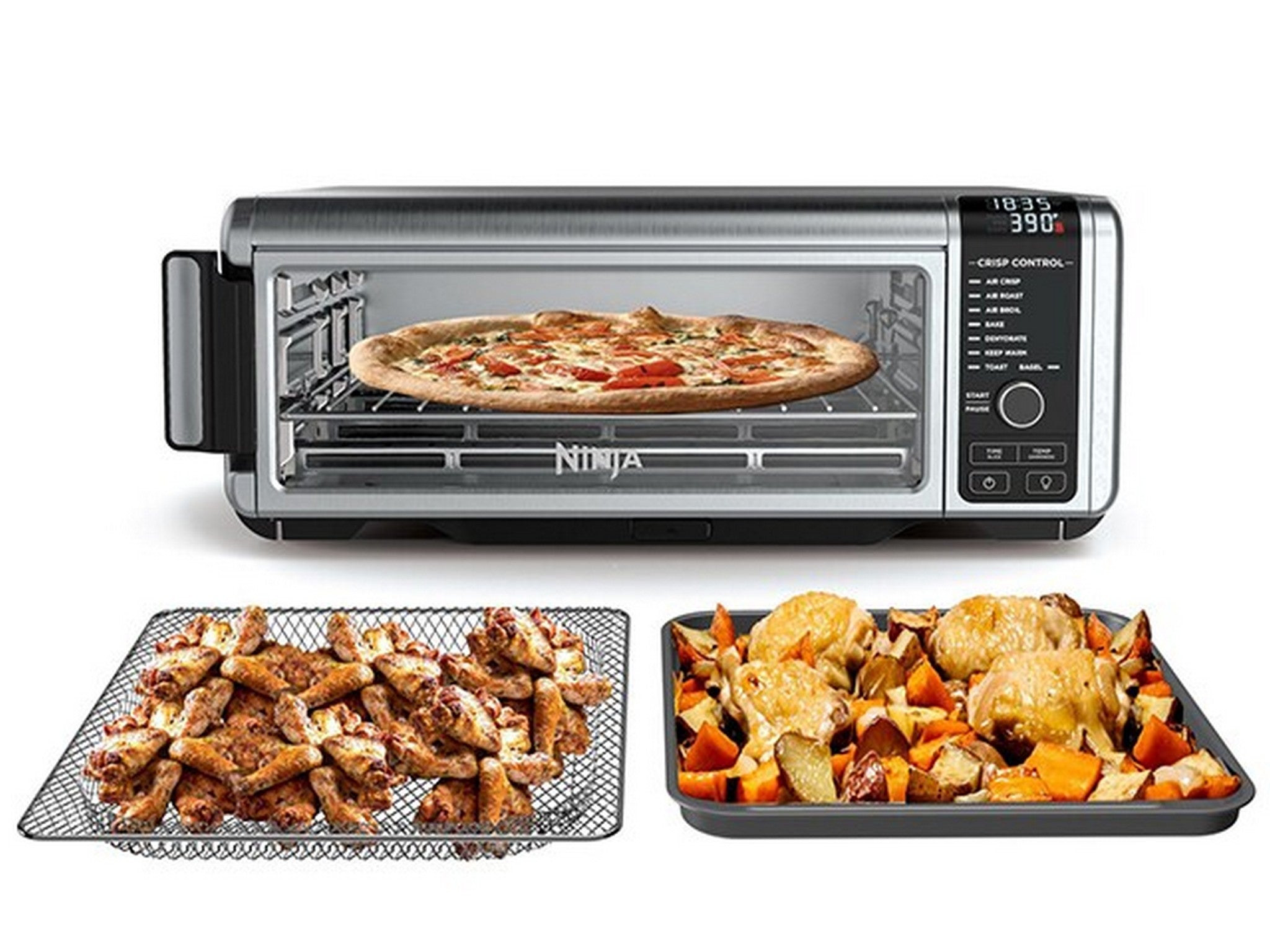 The ultimate meal-making machine: air fry, air roast, air broil, bake, bagel, toast, dehydrate, and keep warm all in one powerful 1800-watt appliance. Reclaim your counter space: takes up 50% less space when you flip it up and away to store against your backsplash. Air fry: up to 75% less fat than traditional frying methods. Tested against hand-cut, deep-fried french fries. Xl capacity: 45% larger usable pan cooking area vs. The flat surface area of the cuisinart toa-60 and toa-65 pan. Fits a 13" pizza, up to 9 slices of toast or 6 chicken breasts (6–8 oz. Each). Easy cleaning: includes a removable crumb tray and an easily accessible back panel for deep cleaning. Fast cooking: cooks up to 60% faster than a traditional oven with air roast; 60 second preheat; full meals in as little as 20 minutes. Even baking: up to 40% more-even baking than the cuisinart air fry oven toa-60. Digital crisp control technology: precision-controlled temperature, heat source, and airflow for ultimate versatility and optimum cooking performance. Toast and bagels done the way you like: use the toast darkness selector to get it just right. Includes: wire rack; 13”x13” nonstick, dishwasher-safe sheet pan; dishwasher-safe air fry basket, removable crumb tray. Dimensions: 19.7” w x 7.5”h x 15.1”d; when flipped up: 19.7" 15.1”h x 7.5”d