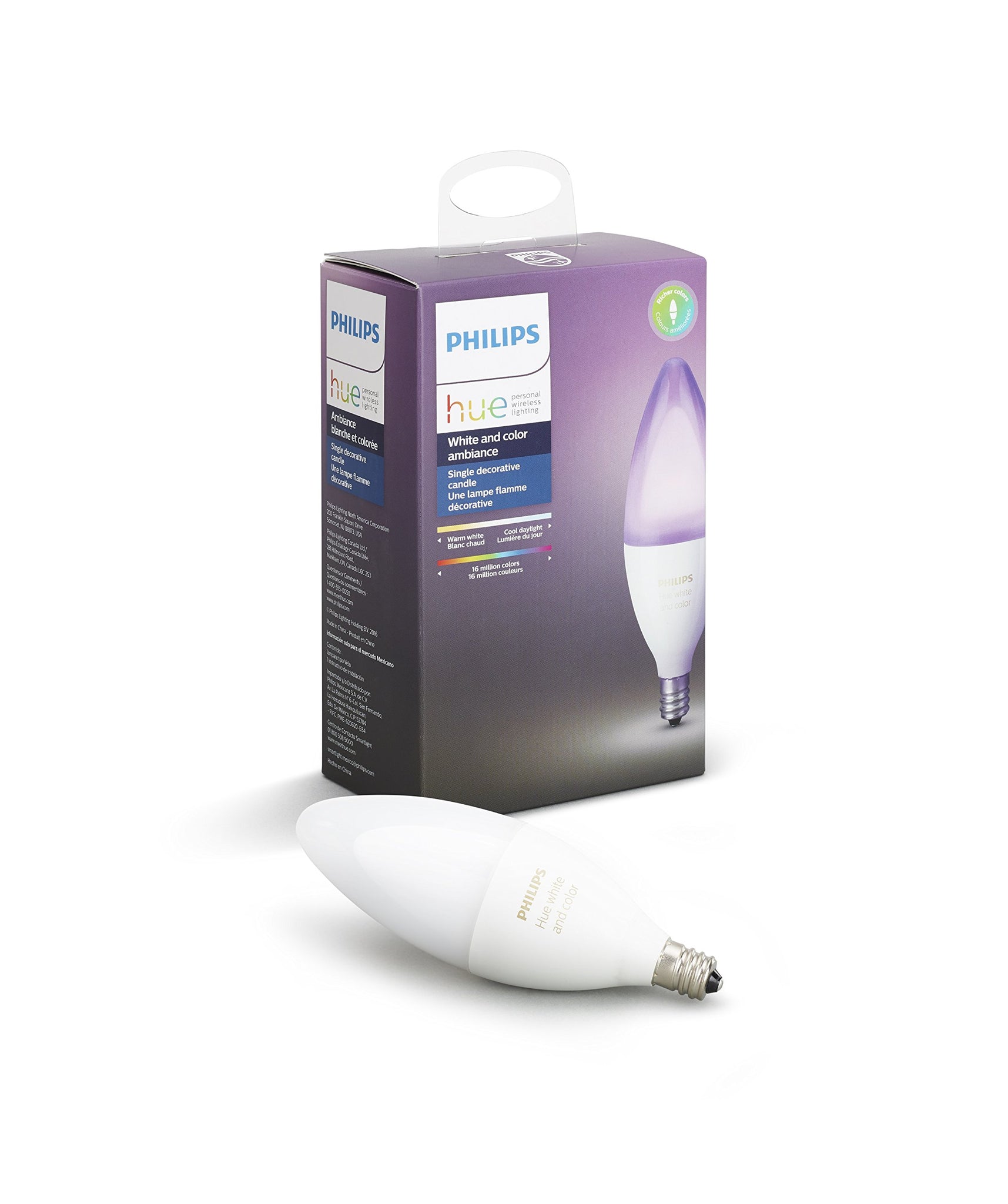 - This box includes one Philips Hue White and Color Ambiance E12 decorative candle, manual, and two-year warranty.