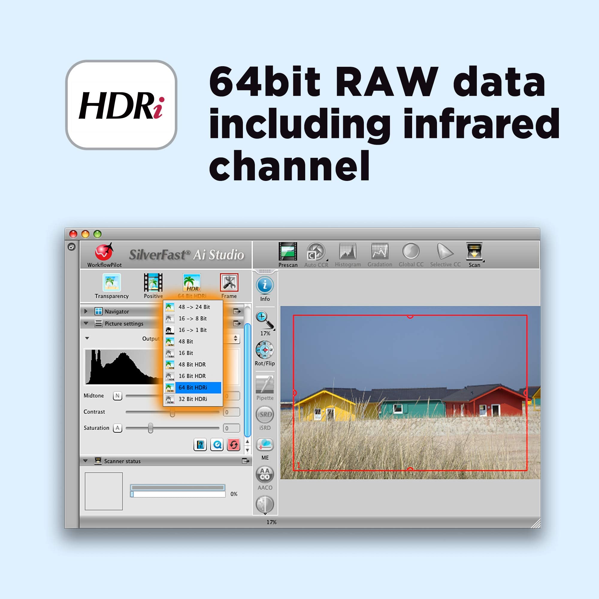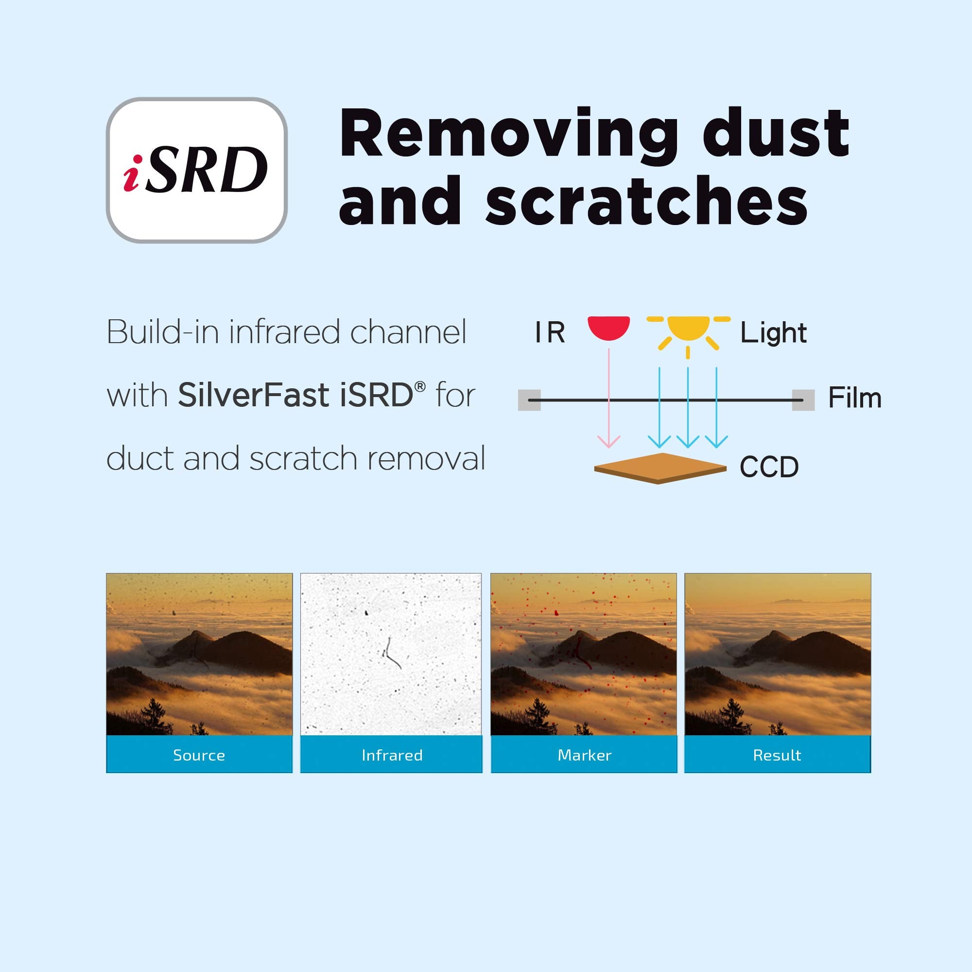 - Built in infrared channel can detect dust and scratches on the surface of the original negatives and slides. It is highly useful for defect removal without retouching the images