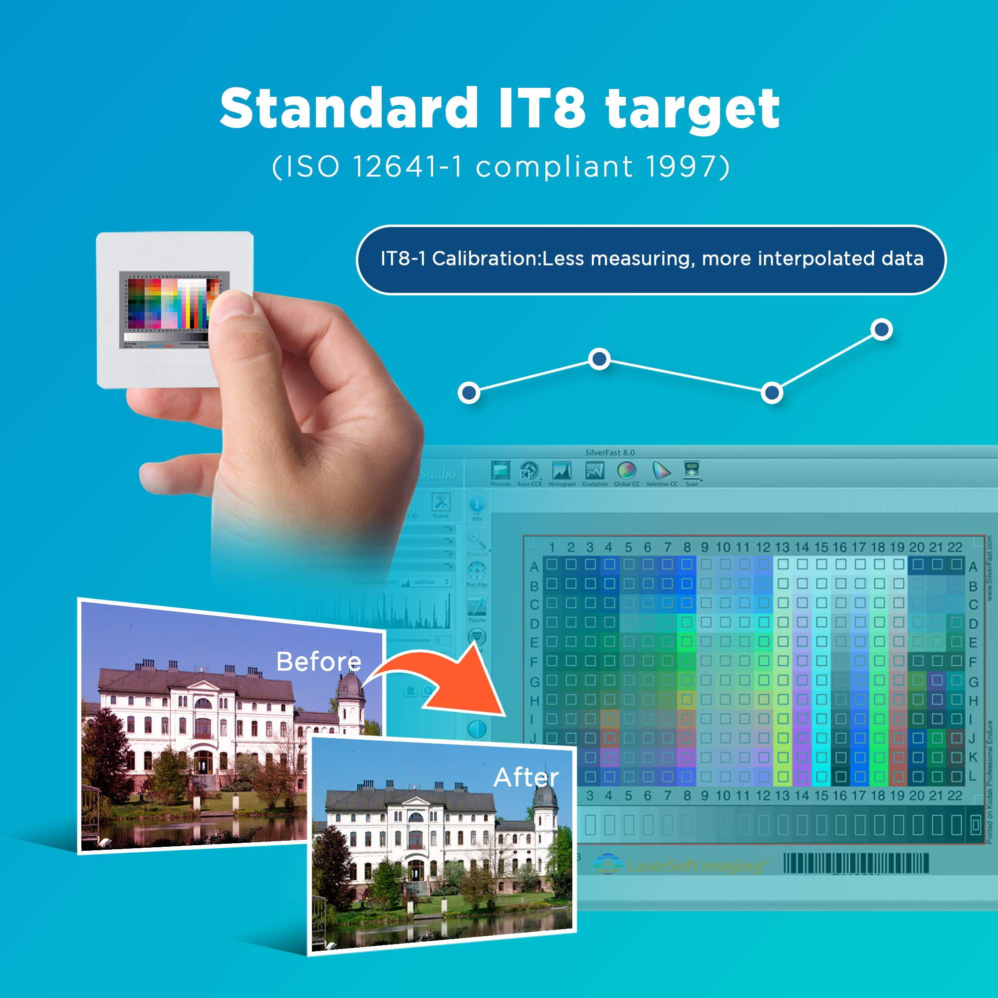 - Standard IT8 Calibration Target (ISO 12641-1 compliant 1997) helps you ensures accurate color results , reducing the need for repeated scans or extensive post processing color correction