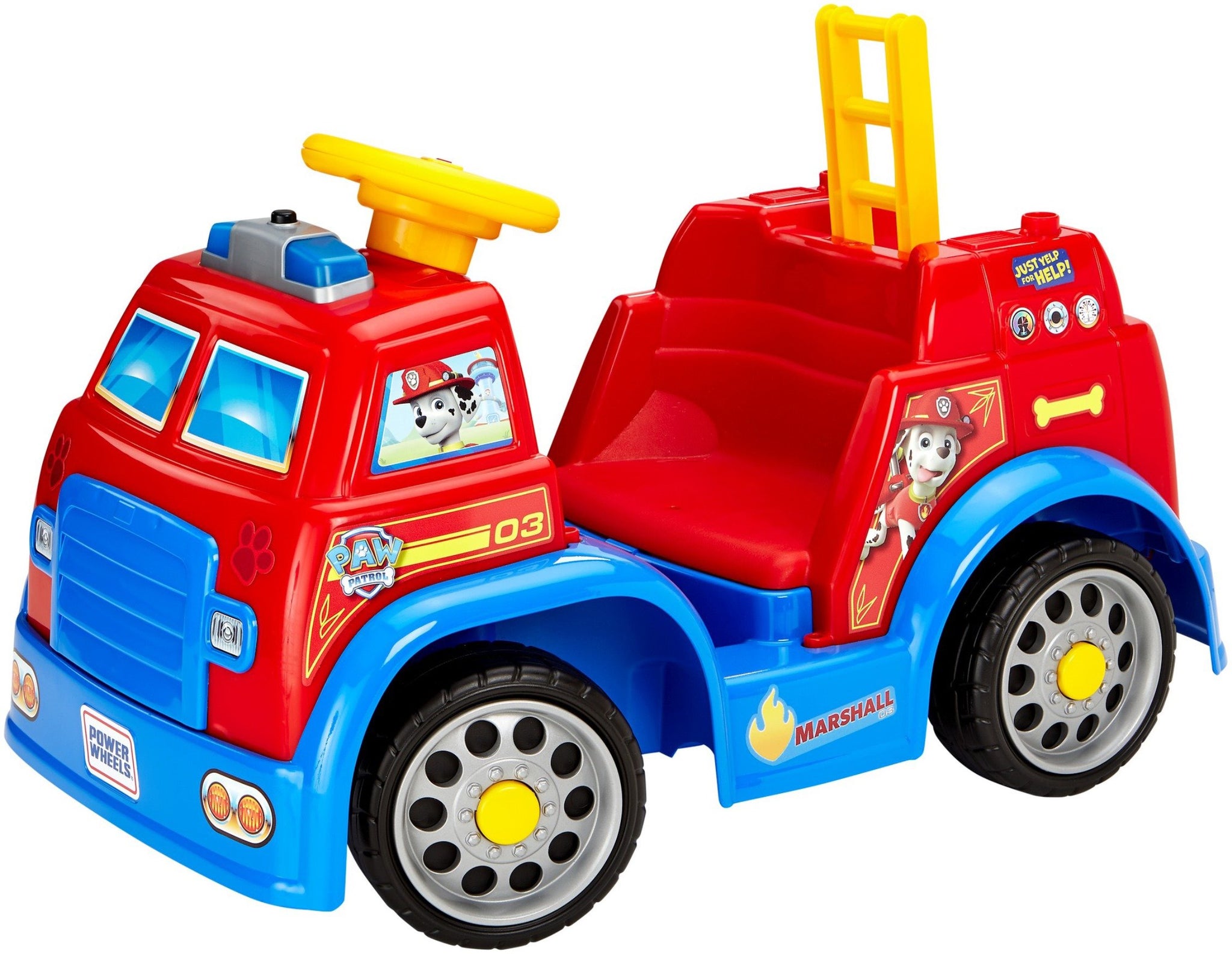 Details: The Fisher-Price Power Wheels PAW Patrol Fire Truck is ready to roll for your little one's next big adventure with realistic lights, sounds & styling - and even a pivoting ladder to spark lots of pretend play. Designed with toddlers in mind, this ride-on features fun PAW Patrol colors and graphics with easy push-button operation and comfortable footrests. 6-volts of battery power provide a fun but safe 2 mph maximum speed. And it rides low, so it's easy for little firefighters to get on and off by themselves. It's as sturdy as it looks - and just as much fun to drive!