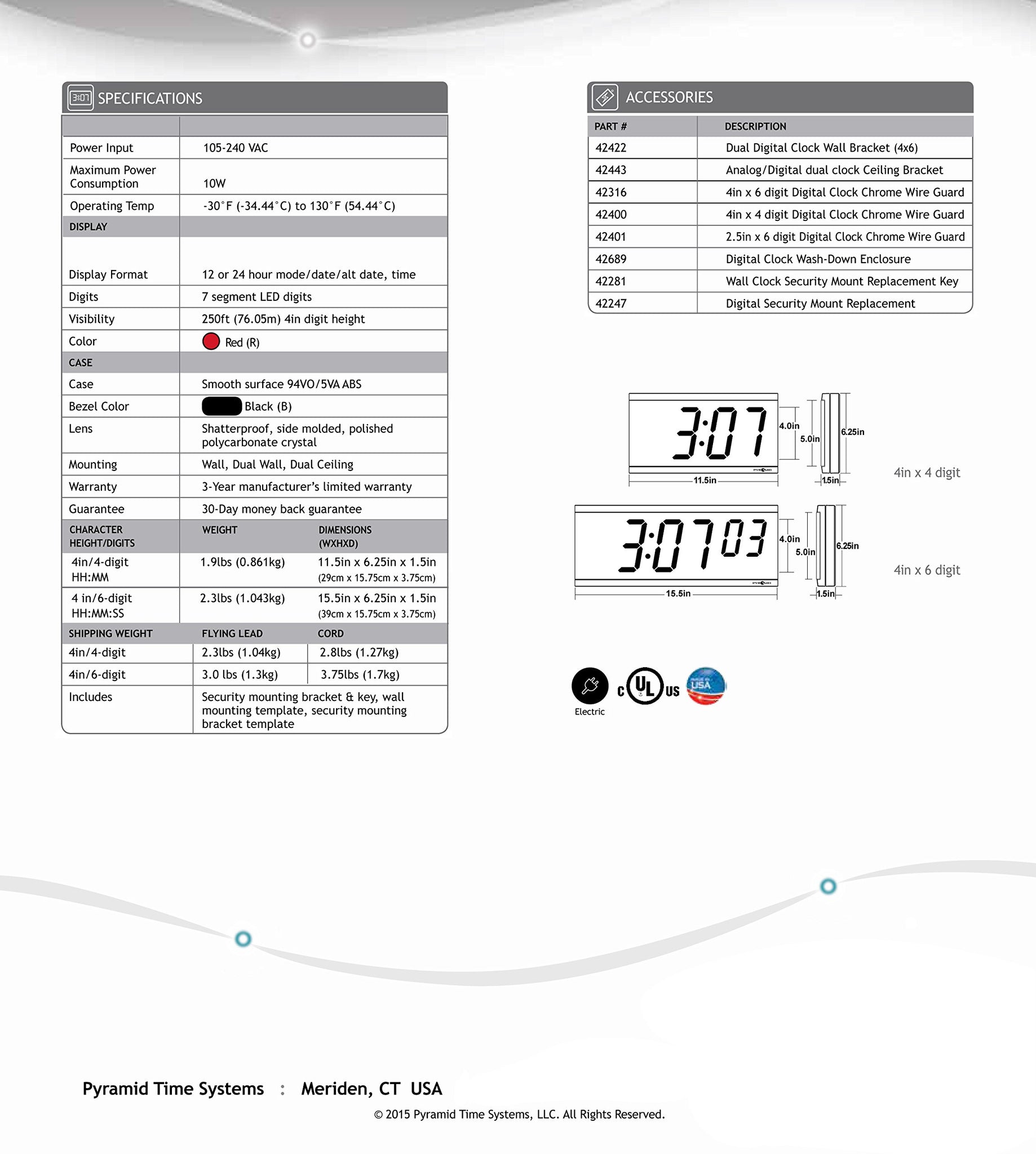 Details: Promote productivity & reliability in the workplace with highly visible time keeping. Vibrant Red LED 4" digits provide optimum visibility. 110 Volt, 6' Cord. Proudly made in USA.
