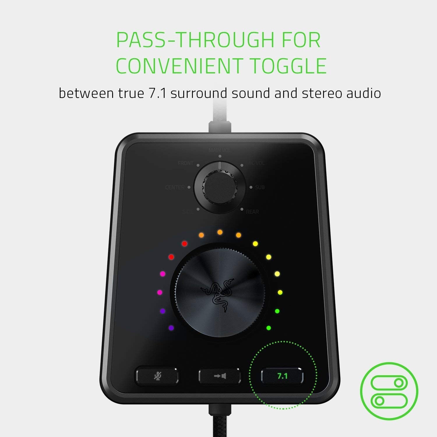 Details: True 7.1 Surround Sound For Pinpoint Positional Accuracy 10 discrete drivers - 5 in each ear cup - built in to the Razer Tiamat 7.1 V2 deliver discrete 7.1 surround sound right into your ears. Hear your games come alive in ways you've never heard before and get the jump on your enemies with pinpoint positional accuracy. Audio Control Unit For Total Sound Customization Mastery The Razer Tiamat 7.1 V2's all-new Audio Control Unit has been designed from the ground up to put more power at your fingertips, and stylishly too, thanks to Razer Chroma lighting. Control the volume of each audio channel, or even toggle between true 7.1 surround sound and stereo audio, to reproduce any source audio perfectly. Premium Comfort and Durability For Extended Play Years of ergonomic engineering and pro-gamer validation has led to the Razer Tiamat 7.1 V2's unique headband construction that ensures balanced weight distribution and reduced clamping force. Plush leatherette ear cushions provide unmatched comfort and sound-isolation. Razer Chroma Lighting With 16.8 Million Customizable Color Options Flaunt your play-style and personality with the Razer Tiamat 7.1 V2's Razer Chroma lighting feature inside the ear cups and on the Audio Control Unit. Explore countless lighting profiles with the 16.8 million customizable color options from your own uniquely programmed palette of colors, to preloaded lightning effects, all set easily through Razer Synapse.
