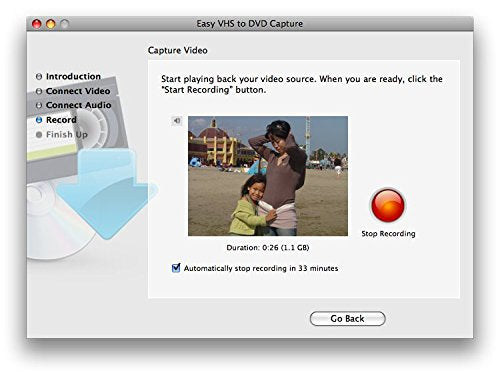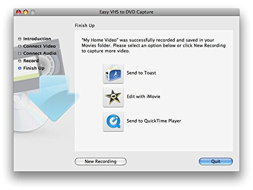 Details: Roxio Easy VHS to DVD for Mac includes everything you need to easily transfer video from VHS, Hi8, V8 or analog camcorders to DVD. Perfect for digitizing and protecting home videos on outdated media. Easy VHS to DVD for Mac supports most analog camcorders, VCRs and even DVD players. Capture video at full DVD-quality resolution. Add Hollywood style menus and chapters for impressive results. Edit your captured movies in iMovie to add titles, transitions and other edits. Great for transferring videos to iPod or PSP too! Post finished videos to YouTube or your favorite social networking sites.