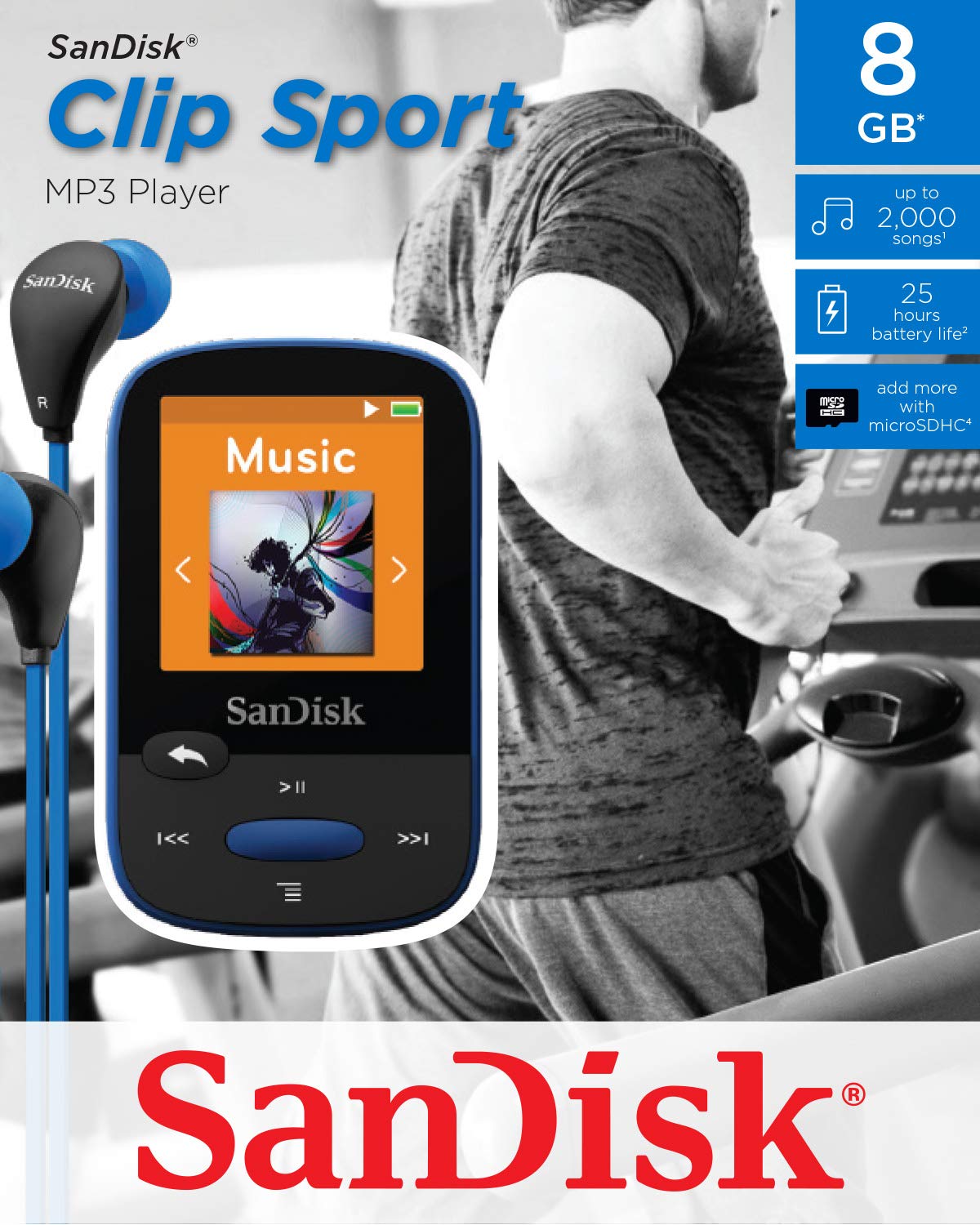 Details: SanDisk Clip Sport 8GB MP3 Player, Blue With LCD Screen and MicroSDHC Card Slot- SDMX24-008G-G46B