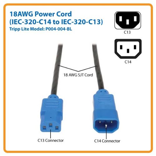 - Features:Blue color-coded C14 and C13 connectors ,18 AWG, 10A, 125V, UL/cUL, ROHS Compliant,