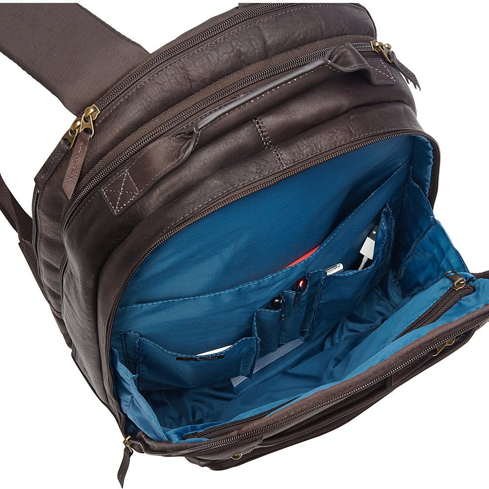 - Padded compartment protects laptops up to 15.6"^Quick access pocket and front zip-down organizer section^Blue interior lining^Padded backpack straps provide extreme comfort^Full-grain leather body with carry handle