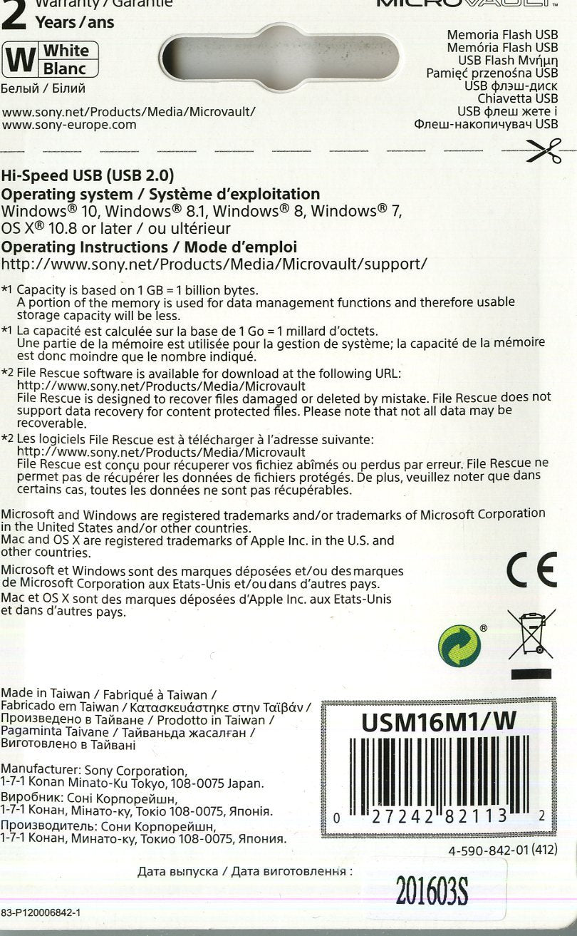 Details: Sony 16GB Micro Vault M-Series USB 2.0 Flash Drive, White (USM16GM/W)