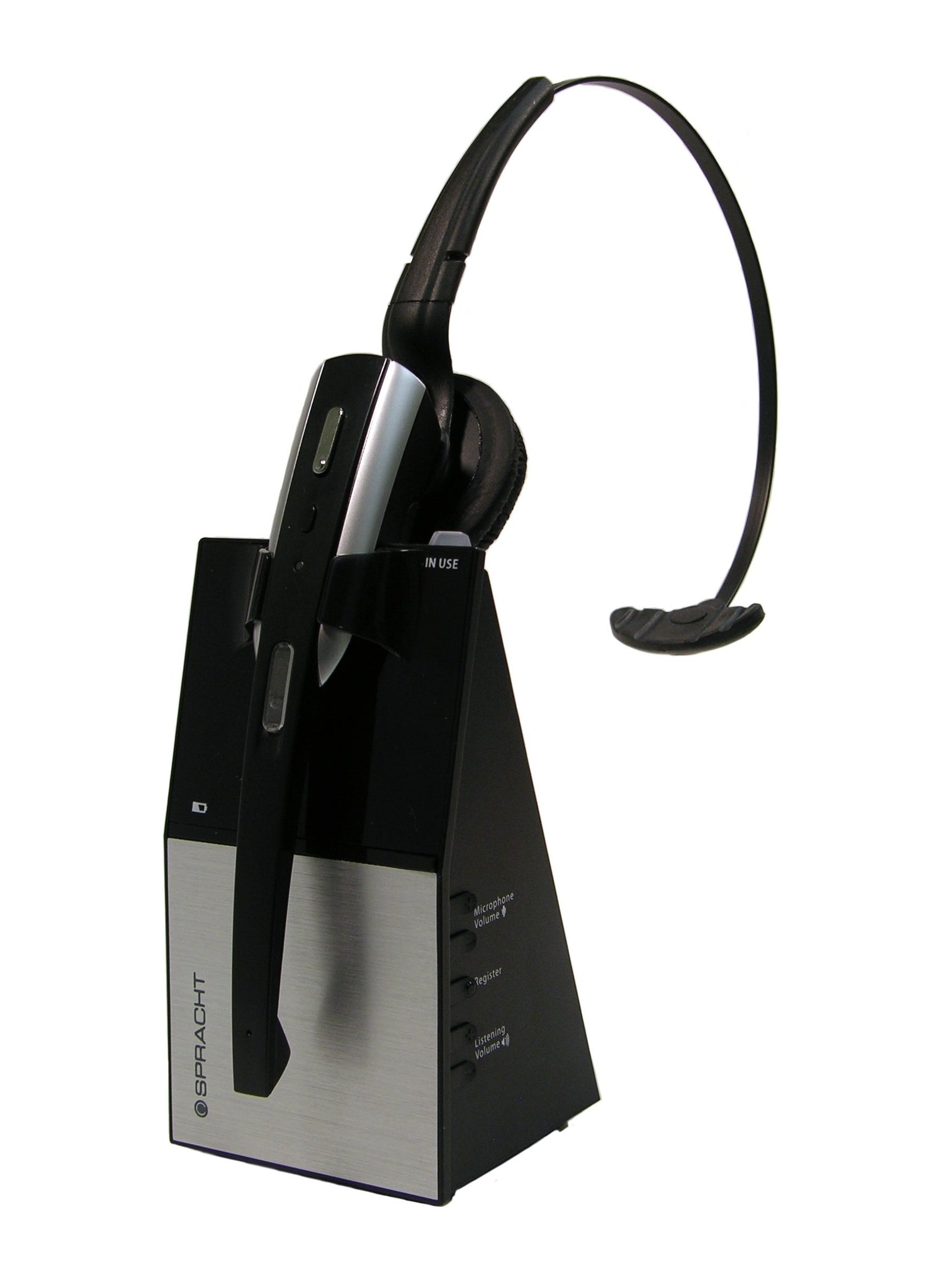 - Secure DECT 6.0 Protocol headset with built in recharger base station. Use over the head 'headgear' or ear hanger