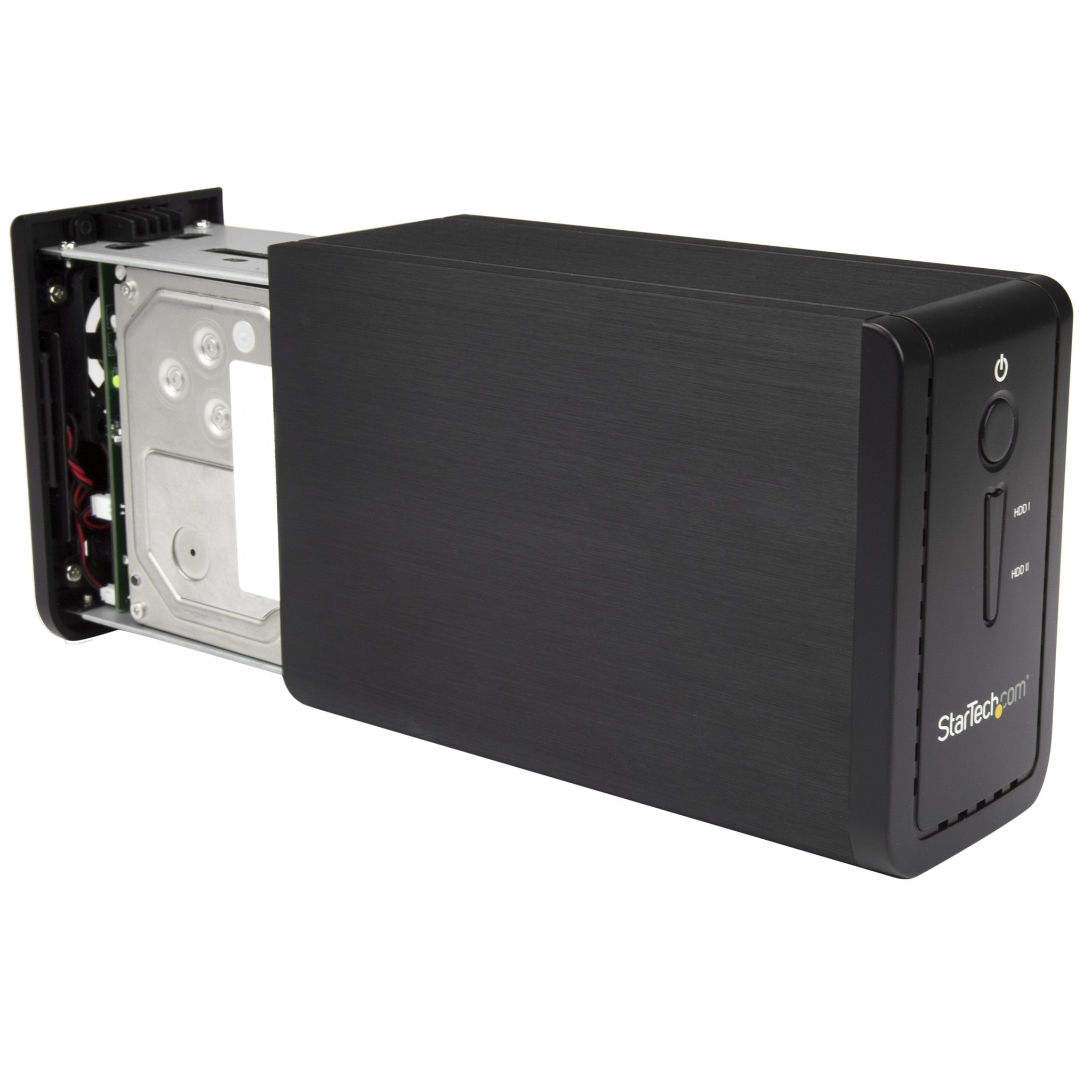 - Solid aluminum enclosure with metal hard-drive mounting tray and built-in fan to assist in heat dissipation / 2-drive 3.5" HDD/SSD RAID enclosure / 2-bay 3.5in enclosure / 2-bay 3.5" HDD RAID enclosure / 2-bay 3.5" SSD enclosure / Dual 3.5" HDD enclosure / Dual bay SATA enclosure / 2-bay 2.5" RAID enclosure