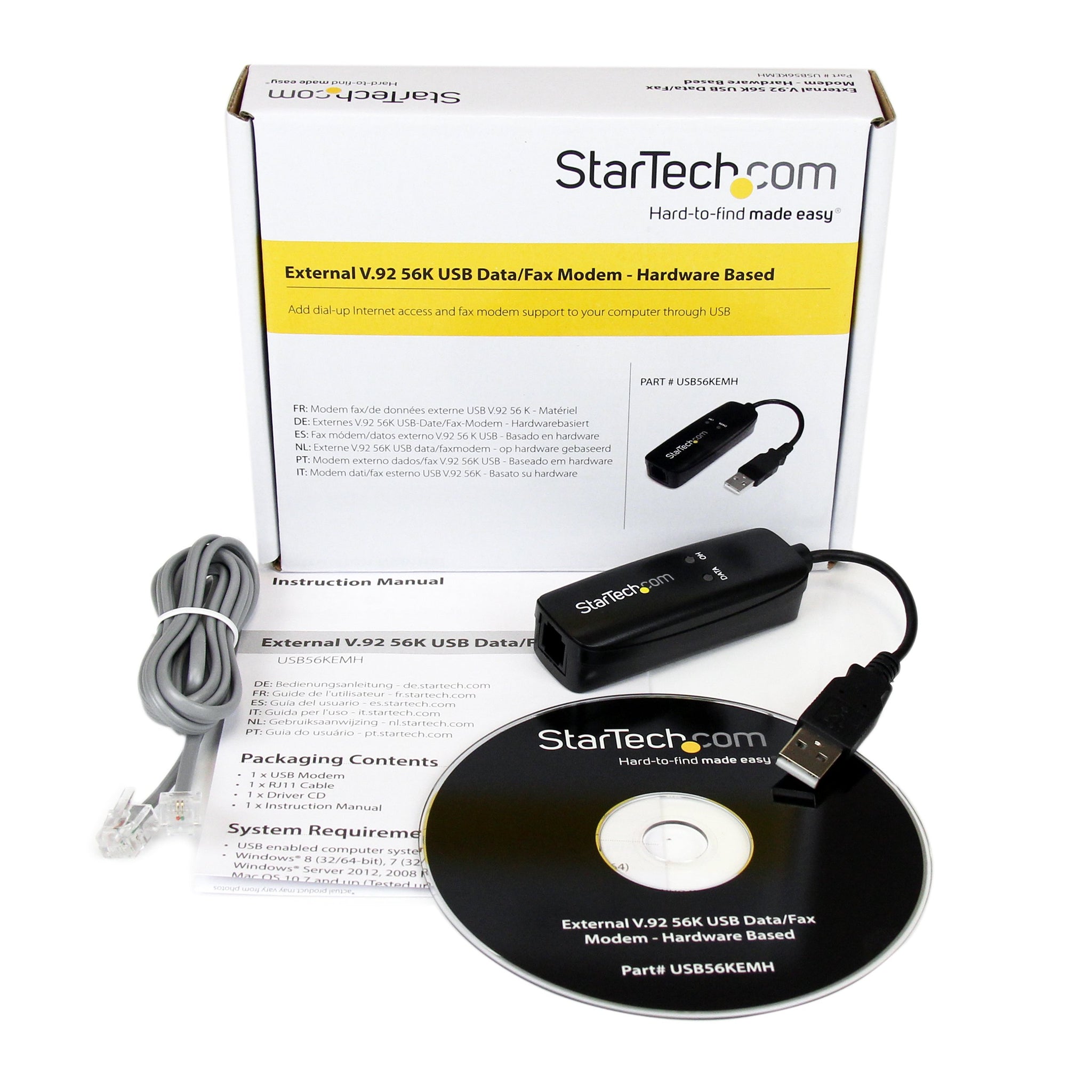 Details: add Dial-up Internet Access And Fax Modem Support To Your Computer Through Usb. The Usb56kemh Hardware-based Usb 56k Modem Lets You Add Dial-up Internet Access And External Fax Modem Support To Your Computer Through Usb. This Controller-based Modem Saves System Resources And Minimizes Load On The Cpu, Using On-chip Processing To Deliver Dial-up Access Without Taxing Your Computer Performance. With Support For Transfer Rates Up To 56 Kbps (data) And 14.4 Kbps (fax), And Compatibility With The Latest Transmission Standards (v.92, V.90, Etc.), This Versatile Usb Modem Can Be Used As A Backup Internet Connection, Or In Rural Areas Where Broadband Connections Are Not Available. To Ensure Portability And Easy Setup, The Usb Modem Features A Compact, Lightweight Design And Is Powered Through The Usb Host Connection, As Opposed To An External Power Adapter. The Modem Also Supports Both Windows And Mac Os Platforms, Providing The Versatility Needed For True Convenience. Backed By A Startech.com 2-year Warranty And Free Lifetime Technical Support.