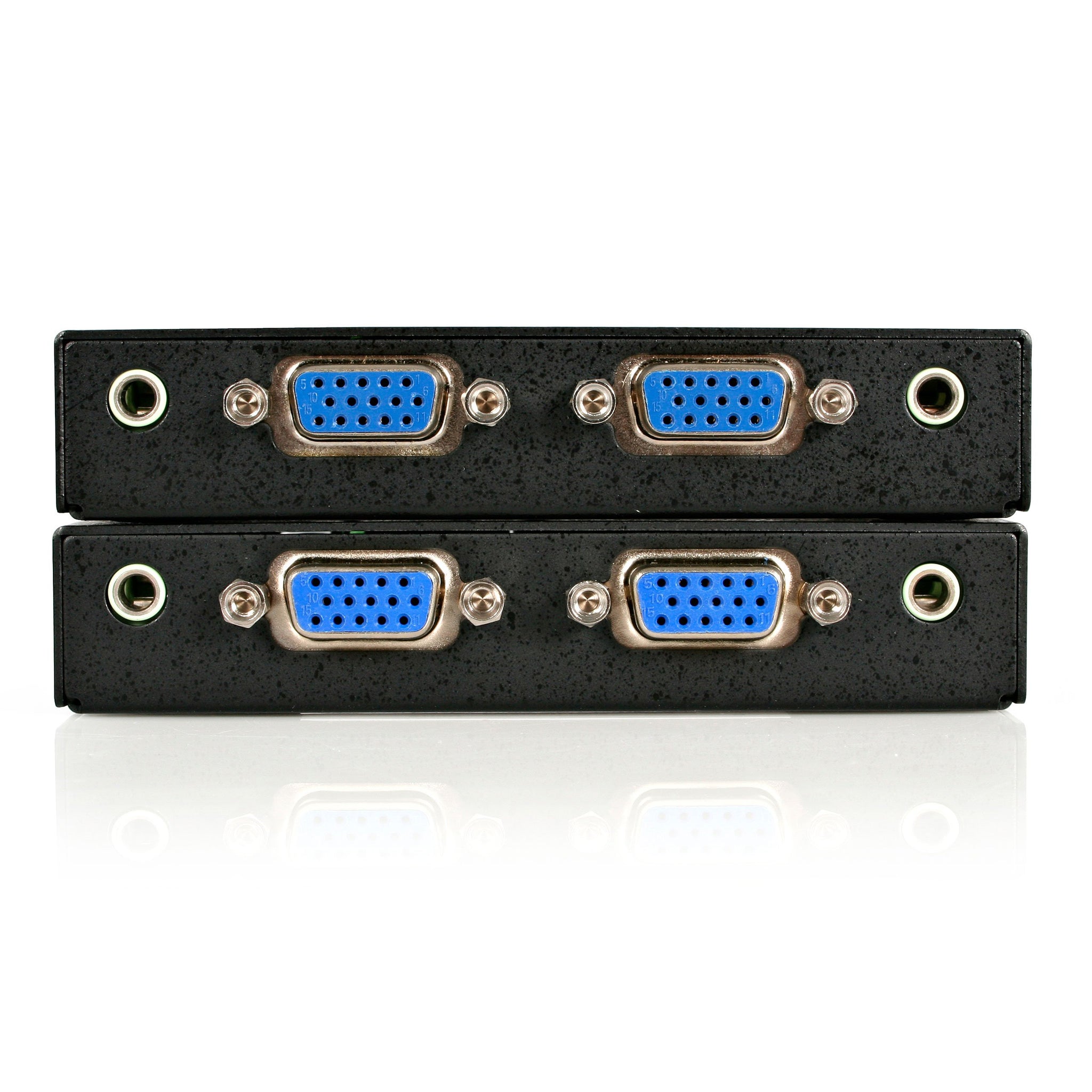 - VGA over Cat5 Extender extends and distributes a VGA signal with 3.5mm Audio to 2 local, and 2 remote displays over Cat5 or better cabling