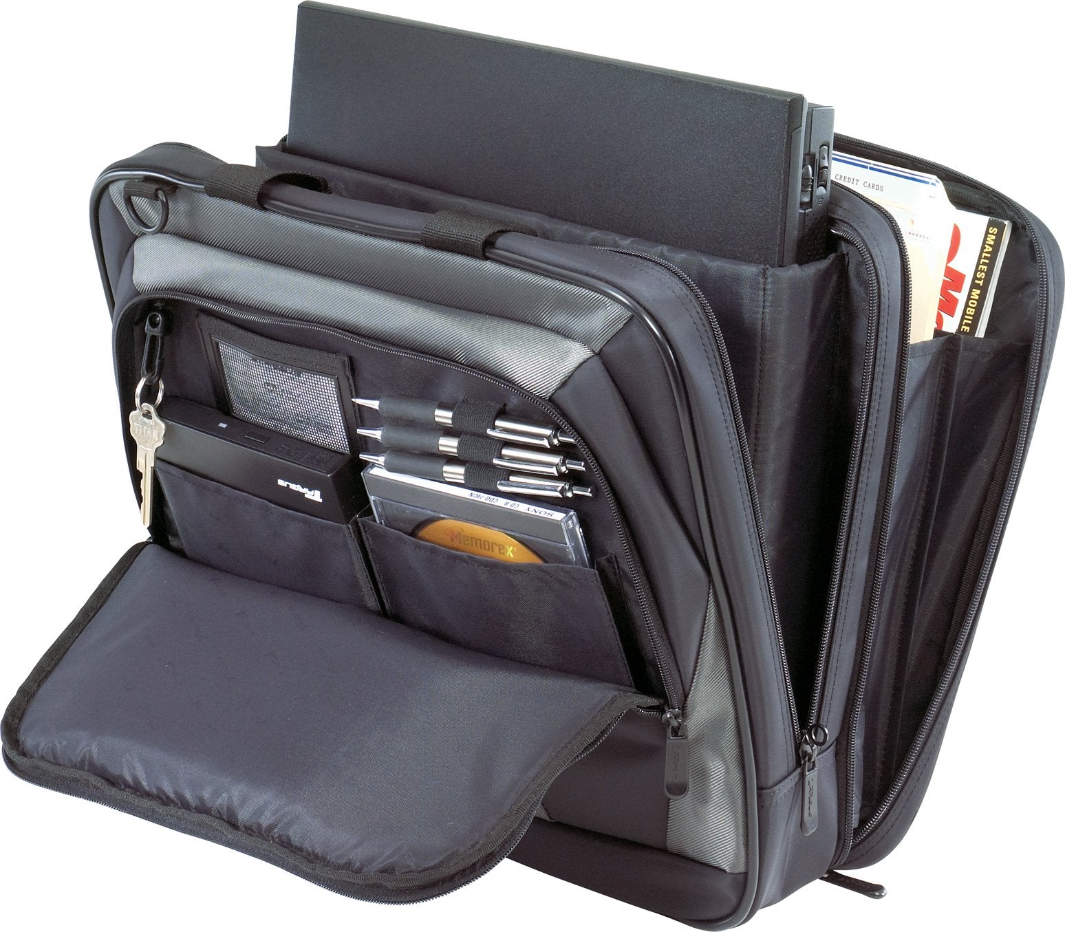 - Front Storage Section Includes Business Card Holder, Pen Loops, Accessory Pockets and Key Clip, Also Features A Divided, Expandable File Section