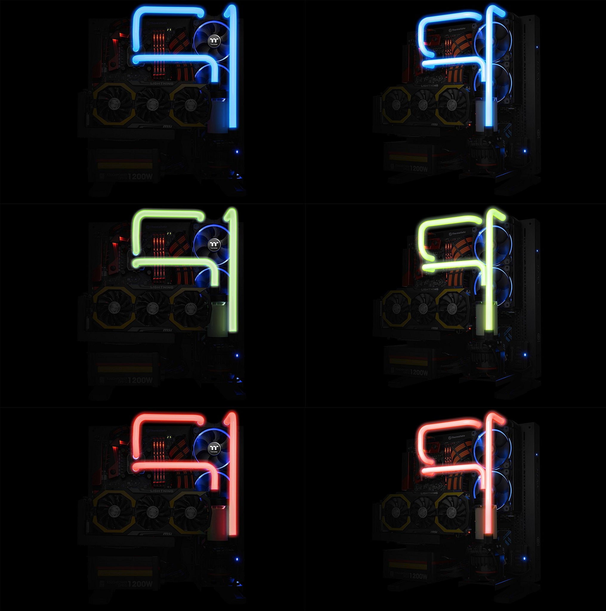 Details: Make your system a showcase for all to see with the newest member of Thermaltake Pacific Series - the Pacific RGB G1/4 PETG fitting 6-Pack Kit. Specially designed for enthusiasts to meet the needs of setting up a complete water cooling system, take advantage of 6 LED lights surrounding each tube to offer colorful light flow even through tube bends. With a RGB LED controller is included, experience options for Brightness, preset 7 color selection, RGB Cycle mode with "Color Lock" feature with Flash and Blink mode options. With a patented circular 256 multicolored LED light and produced by durable copper, brighten and color all Your Life! 2 Year Warranty.