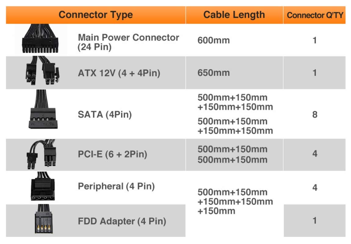 - 24 Pin x 1, ATX 12V 4+4 Pin x 1, SATA 4 Pin x 8, PCI-E 6+2 Pin x 4, Peripheral x 4, FDD Adapter x 1