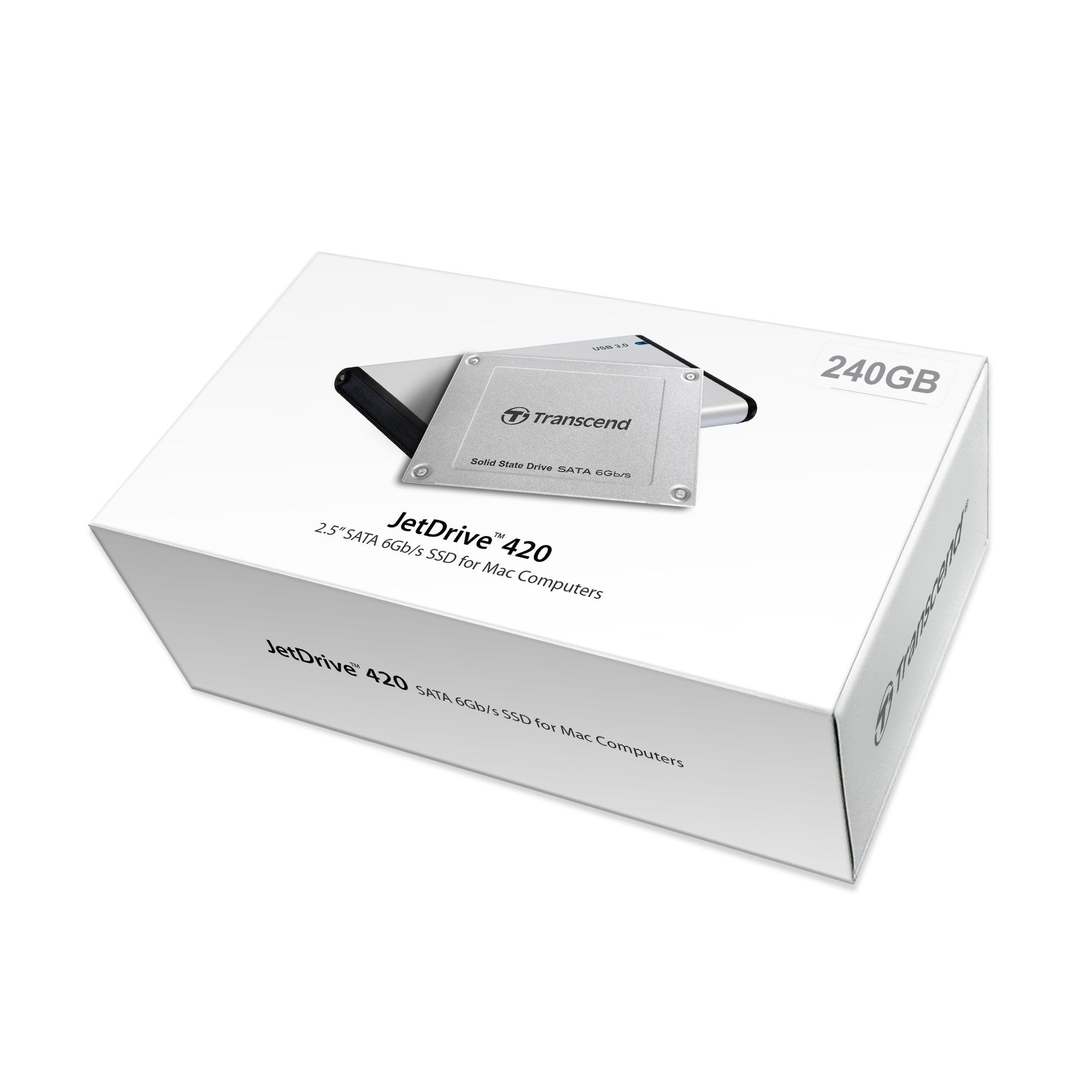 Details: Bring the speed back.Is your Mac getting sluggish? We've got your back! Transcend's JetDrive 420 SSD replaces the current drive in your MacBook Pro , MacBook or Mac mini , breathing new life into your Mac. Transcend's JetDrive SSDs are also backed by an industry-leading 5-year warranty.Boot faster. Work smarter.Built with the highest quality MLC flash memory and proprietary SSD controllers, JetDrive 420 turbocharges your Mac. Compared to traditional hard disk drives, JetDrive 420 transfers data up to 5 times faster. Its superior performance drastically improves computer startup and program launch times.A new level of reliability.JetDrive 420 reduces the risk of data loss caused by shock or vibration by having zero moving parts. Moreover, built-in wear-leveling and TRIM support prevent speed degradation and extend the lifetime of your SSD.Your old drive reborn.Transcend's JetDrive 420 SSD upgrade kit comes with an external enclosure that supports the SuperSpeed USB 3.0 interface. Just pop your original HDD or SSD in the enclosure, and you've got a sleek, new external storage device. Take control with JetDrive Toolbox.Exclusively developed by Transcend for JetDrive SSDs, JetDrive Toolbox monitoring software leverages S.M.A.R.T. technology to analyze its health status. Additionally, it can enable TRIM support for your JetDrive in OS X , maintaining optimum write speeds and maximizing the lifetime of your SSD.Everything you need.The package includes all the tools you need:MacBook-compliant SSDUSB 3.0 EnclosureScrewdrivers (T6 & PH00)Travel Pouch USB CableQuick Installation Guide & Warranty Card*Upgrading JetDrive 420 to Mac mini requires additional tools.