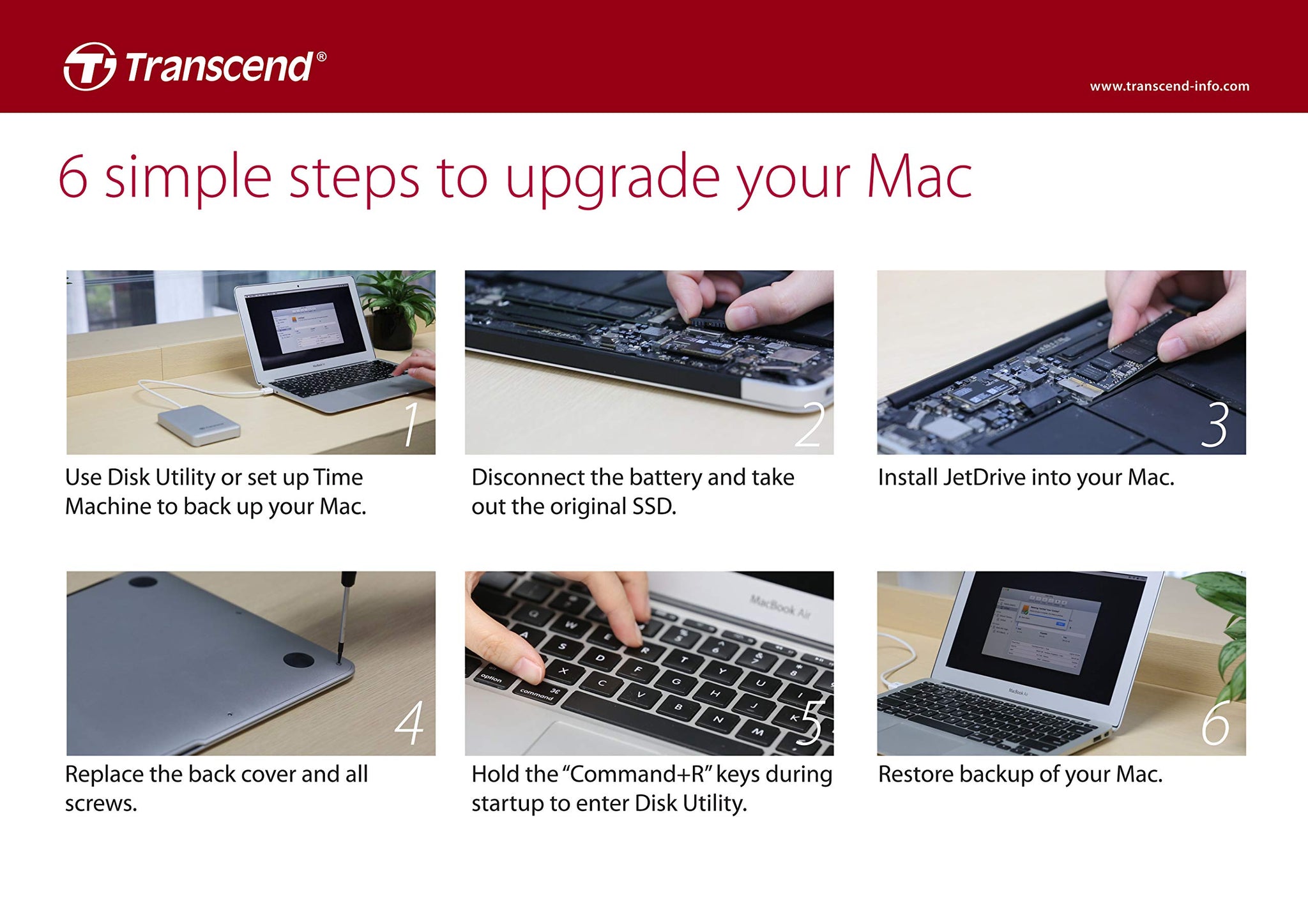 - Stop fretting about storage space. Transcend's JetDrive SSD upgrade kit offers up to 960GB of storage capacity. Upgrading your Mac to a JetDrive SSD ensures you'll have plenty of space for all your favorite music, videos, and photos.