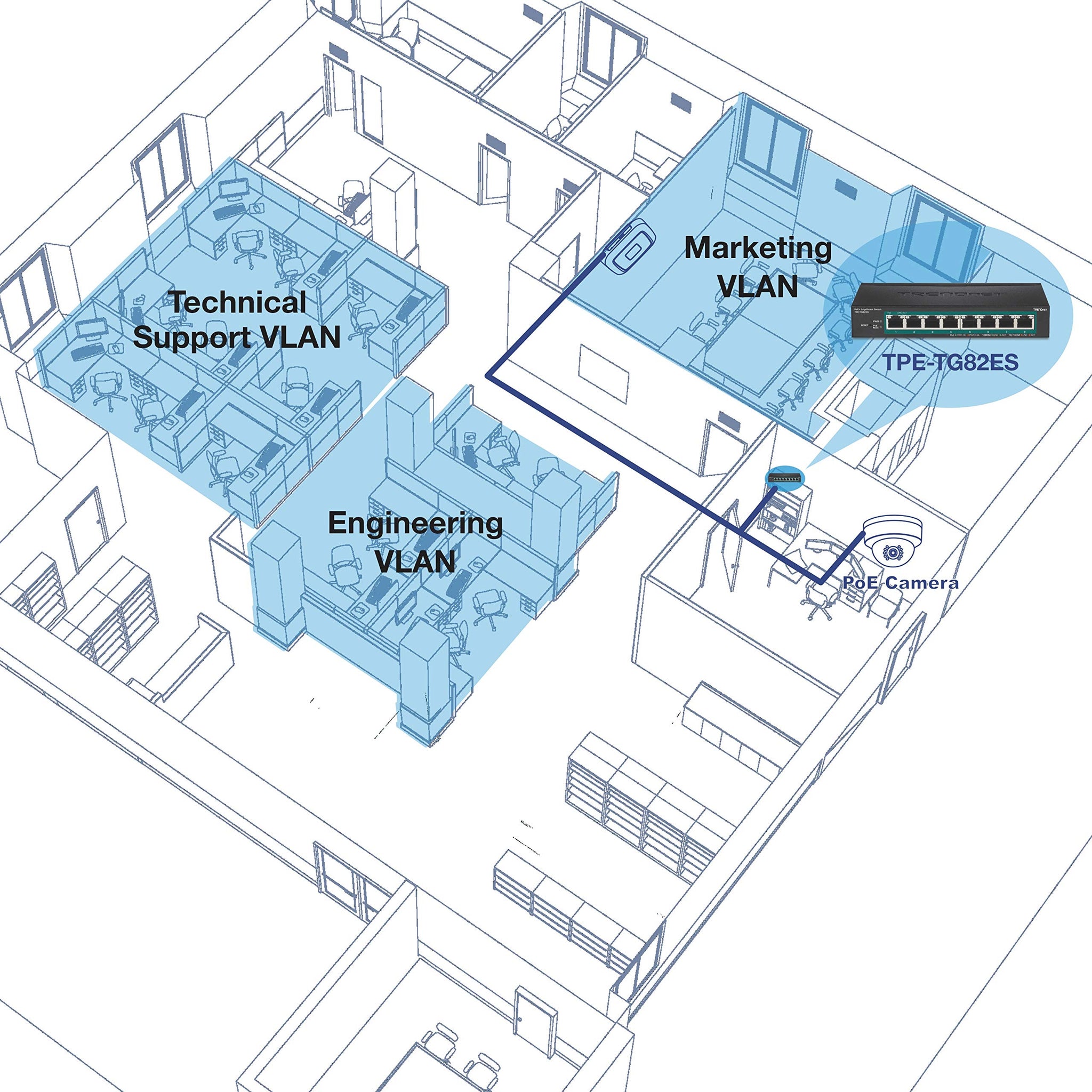 - PoE+ POWER: A 64W PoE power budget supplies up to eight Power over Ethernet devices.