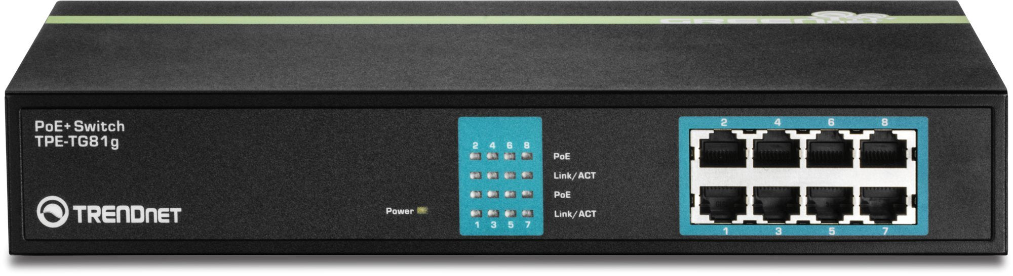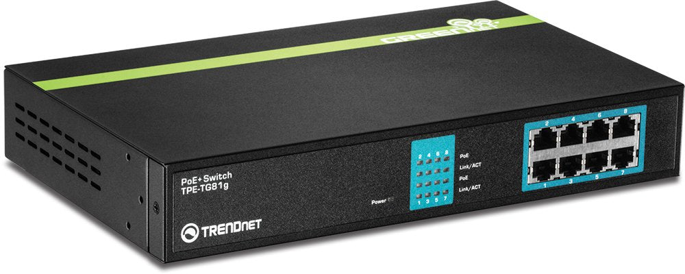 Details: TRENDnet's 8-Port Gigabit GREENnet PoE+ Switch, model TPE-TG81g, reduces equipment and installation costs by delivering data and power over existing Ethernet cables. This unmanaged switch offers eight Gigabit PoE+ ports which supply up to 30 watts of power per port for devices such as high power wireless access points, PTZ (Pan / Tilt / Zoom) internet cameras, and VoIP telephony systems.This rack mountable switch features an internal power supply. Auto sensing technology delivers 30 watts to 802.3at PoE+ devices (up to 3 devices), 15 watts to 802.3af PoE devices, and only data to non-PoE devices. GREENnet technology reduces energy consumption by up to 75% when the switch is not in use. Boost office efficiency and reduce network congestion with a total switching capacity of 16 Gbps. LED indicators display device status for efficient troubleshooting. This switch comes in a sturdy metal case and quickly adds PoE+, PoE, and non-PoE devices to your network.
