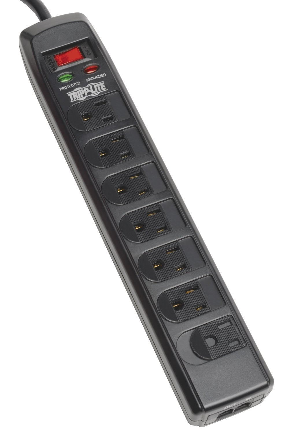 - RIGHT-ANGLE OUTLETS FOR AC SURGE SUPPRESSION & TEL/FAX/MODEM PROTECTION: This surge strip features seven outlets in a convenient right-angle array for convenient device connections. Phone line surge suppression protects both dialup and DSL modems, plus fax machines, cordless phones and more (pair of RJ11 jacks, 1 line, includes 6 ft. phone cable).