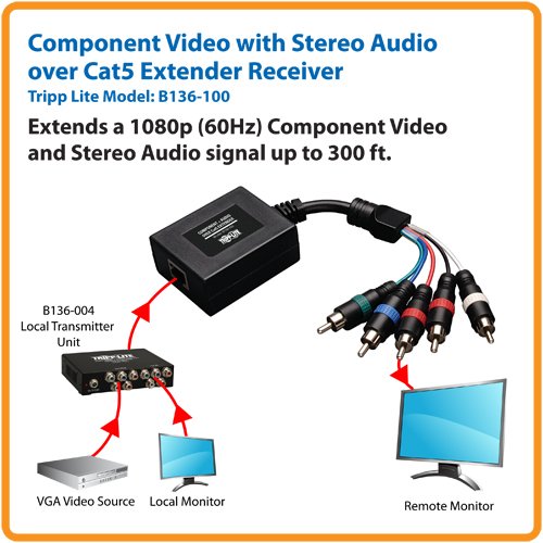 Details: The B136-100 is a remote extender unit for the B136-004 4-Port Component Video + Stereo Audio Extender/Splitter. A 1080p (60Hz) Component Video and Stereo Audio signal can be extended up to 300 ft. when using 24Awg, Solid Wire UTP cable (Tripp Lite N202-S