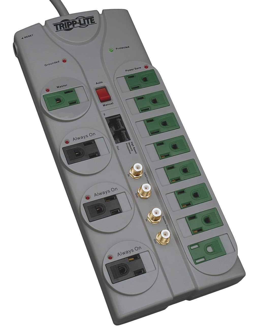 Details: Tripp Lite Tlp1210Satg 12-Outlet Surge Suppressor. Brand: Tripp Lite. TRPTLP1210SATG. 12 Outlets-1 Slave, 8 Eco, 3 Always On. 2160 Joules. Rj45 Protection. Turns Outlets Completely Off When The Master Device IS Idle Or Shut Down. Switch Allows For Green Operation Or Always On. Micro Switch Allows Unit To Work With Netbooks & Notebooks. 3 Sets Gold Coaxial Connections. 10-Ft Cord With Flat-Profile Plug. Lifetime Warranty. $150,000 Connected Equipment Warranty. Product Class: Surge Protectors/Iups. UPC: 37332152541. Manufacturer's Warranty: Lifetime Warranty.