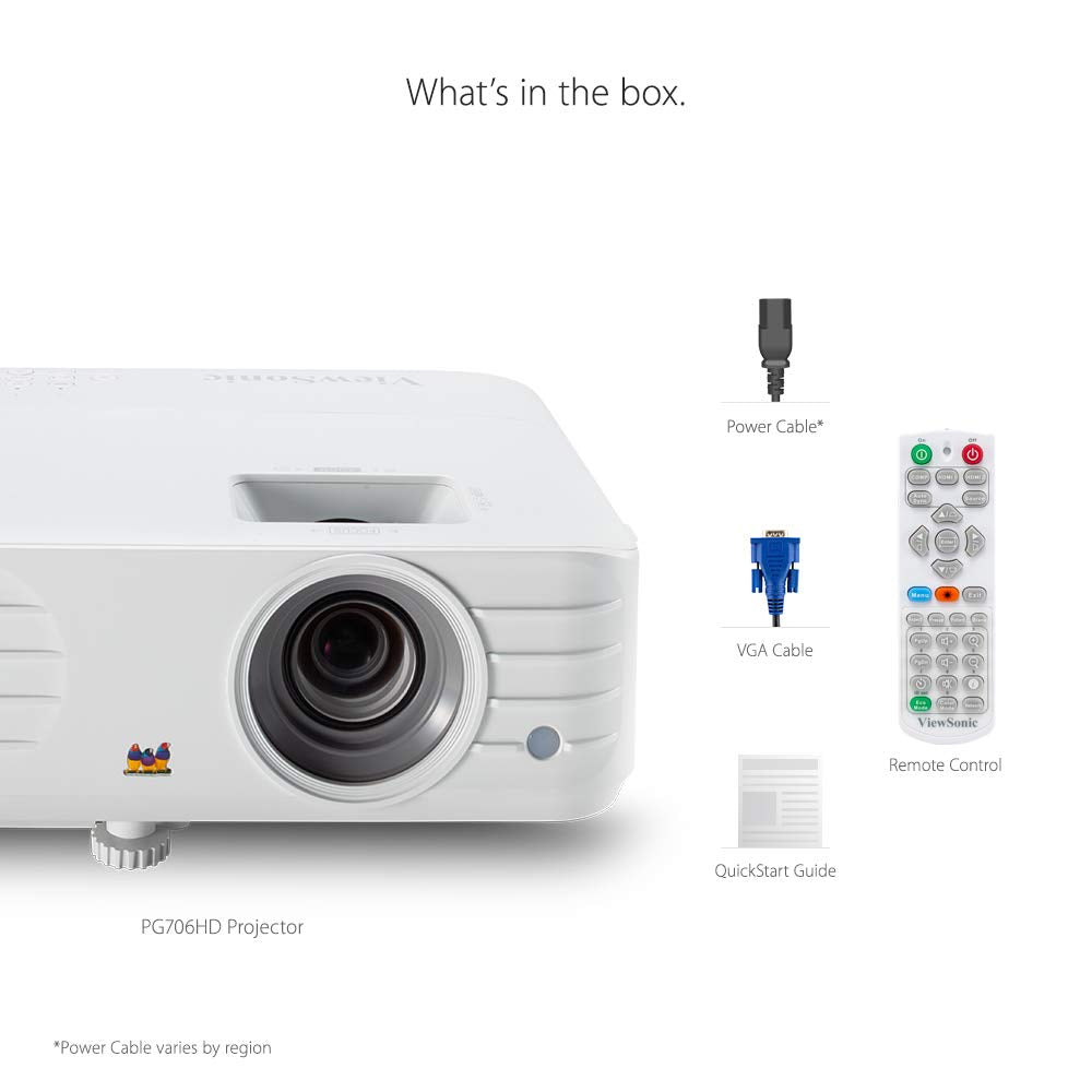 - INCLUDED IN THE BOX: PG706HD Projector, Power Cable, VGA Cable, and Remote Control