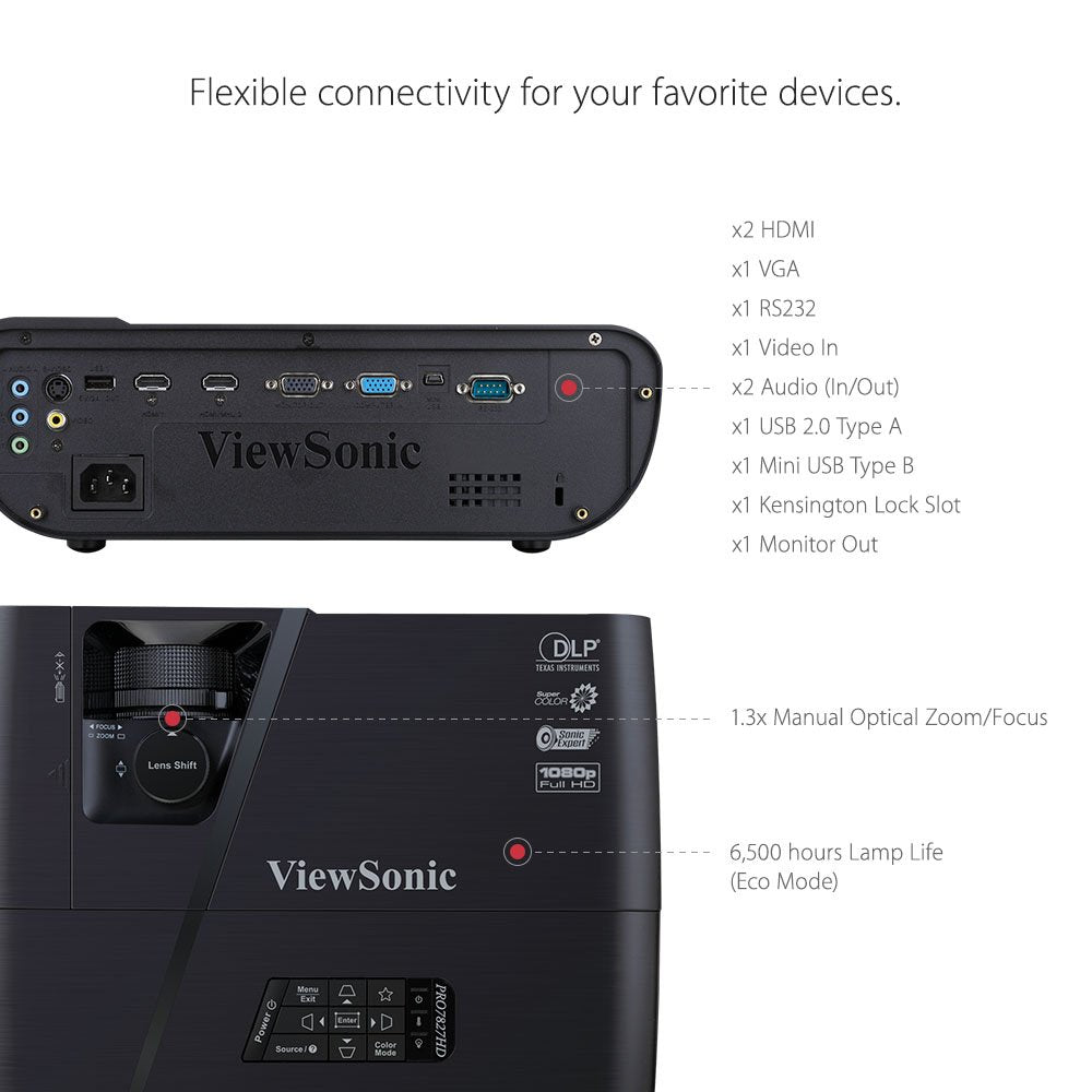 Details: Offering incredible color accuracy and stunning, razor-sharp images, the ViewSonic® LightStream Pro7827HD is the ideal projector for home theater entertainment. Featuring Full HD 1080p resolution and ViewSonic’s SuperColor™ RGBRGB technology, this projector delivers incredible detail and brilliant color gradient coverage for amazing image projection. Designed with ISF certified day and night modes and a choice of five unique view modes fit for different scenarios, the Pro7827HD delivers optimized color for a true cinema experience. SonicExpert™, ViewSonic’s proprietary sound enhancement technology, powers a 10W speaker to deliver incredibly clear and audible sound. PortAll™, a neatly designed and enclosed HDMI/MHL dongle compartment, also features an integrated micro USB cable. With a shorter throw ratio, vertical lens shift, 1.3x optical zoom, smart design, and extensive connectivity, the Pro7827HD provides flexible and quick set-up in any home.