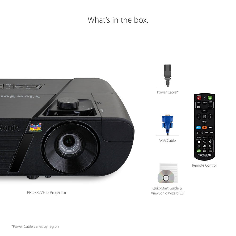 - INCLUDED IN THE BOX: PRO7827HDL 1080p Projector, Power Cable, VGA Cable, Cable Management Cover, and Remote Control