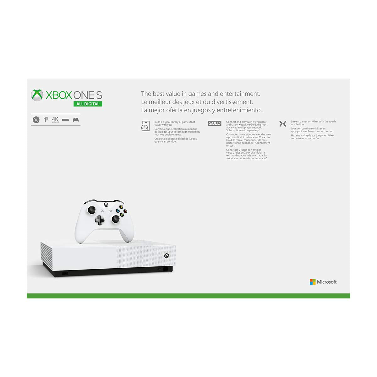 - Includes 1TB Xbox One S All-Digital Edition Console (Disc-free Gaming), wireless controller, 1-Month Xbox Live Gold subscription, & download codes for Minecraft, Forza Horizon 3, & Sea of Thieves