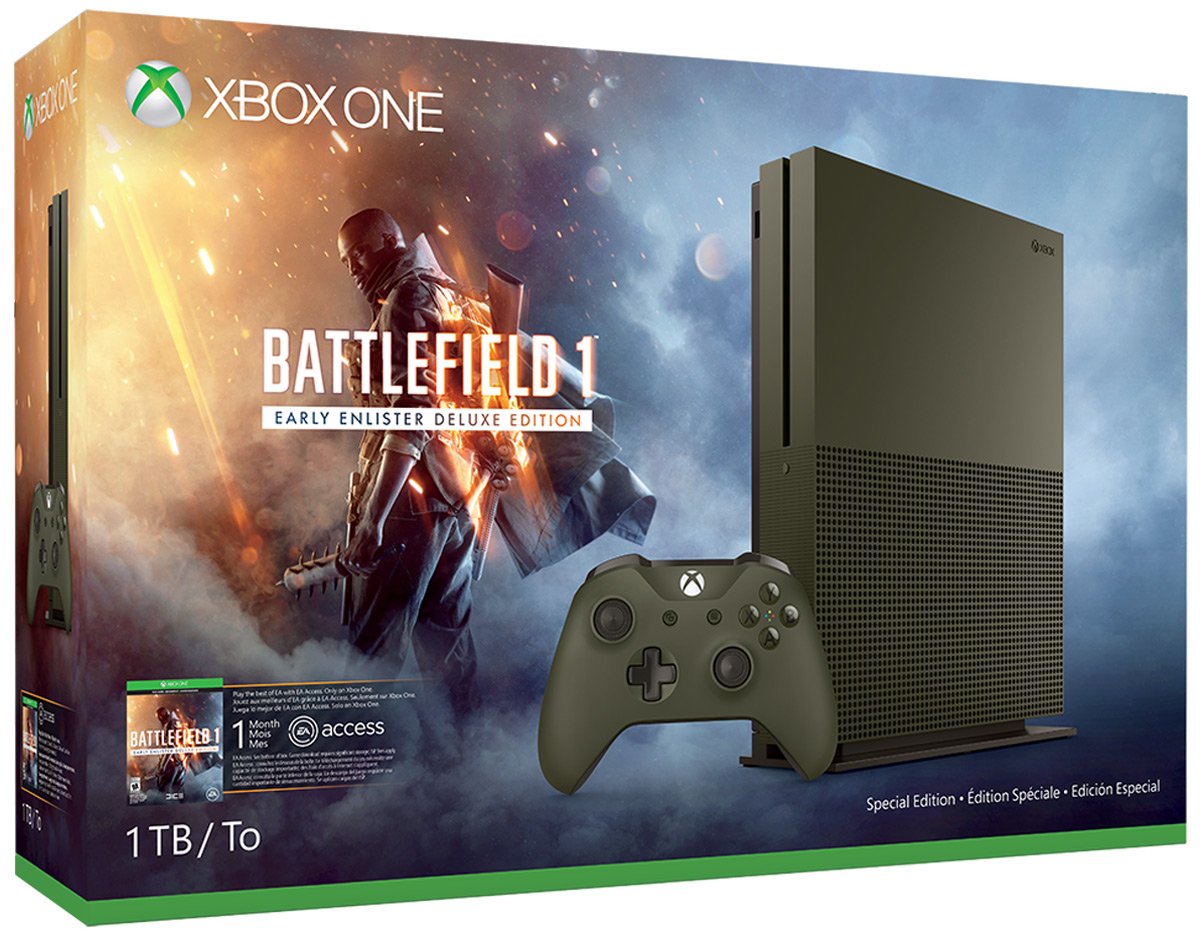 - This bundle includes: Xbox One S Special Edition 1TB Console, full game digital download of Battlefield 1 Early Enlister Deluxe Edition, military green stand and controller, HDMI cable (4K Capable), power cable, and a 14-day Xbox Live Gold Trial
