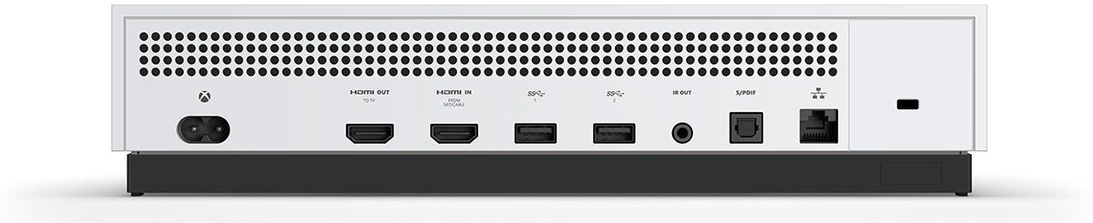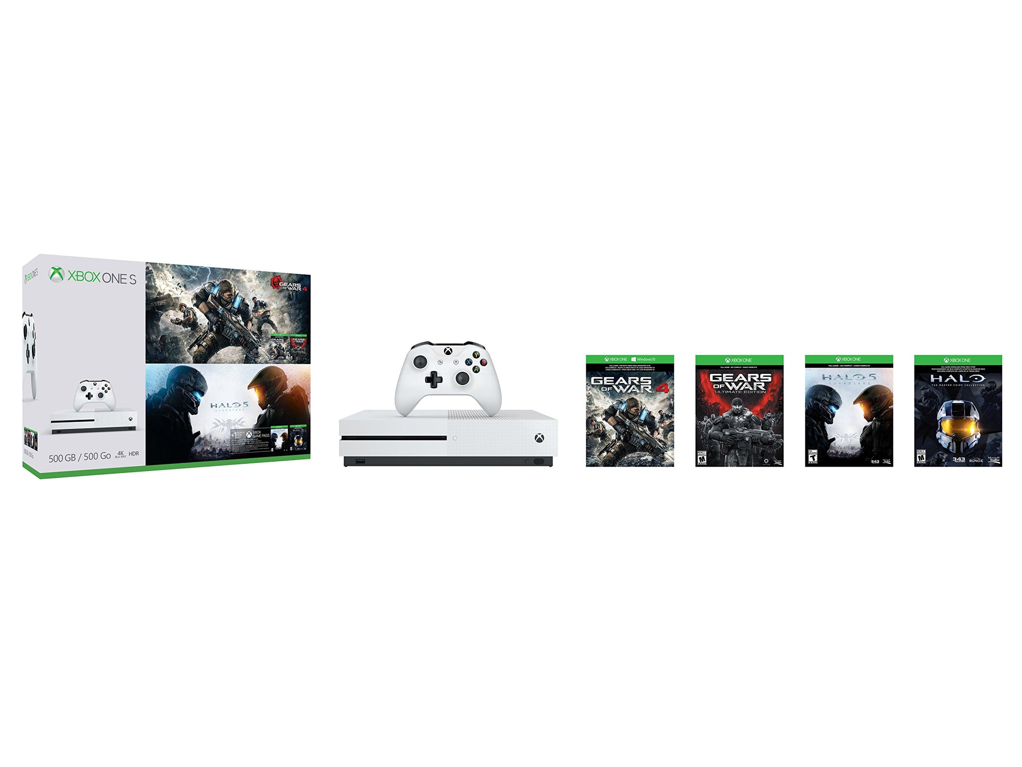 Details: In the box: Xbox One S 500GB console (White), Xbox Wireless Controller (White), Gears of War 4 full game download (Xbox Play Anywhere), Halo 5: Guardians full game download, Gears of War: Ultimate Edition full game download, Halo: The Master Chief Collection full game download, 1-Month Xbox Game Card, HDMI cable, Power supply.