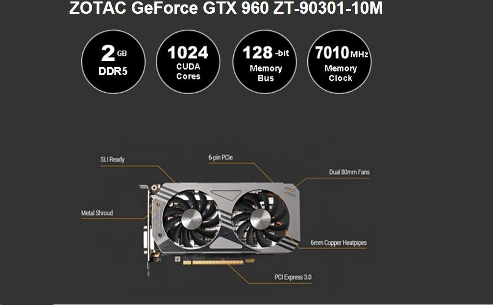 Details: the Zotac Geforce Gtx 960 Is A High-performance Graphics Card Designed With Gamers In Mind. Powered By The Next-generation Nvidia Maxwell Architecture, The Card Delivers Incredible Performance, Unmatched Power Efficiency, And Cutting-edge Features. The Gpu Represents A Vast Improvement Over The Performance Of Prior-generation Cards That Delivers A Smooth Gaming Experience. Combined With The New Freeze Technology Which Disables The Dual 80mm Fans When Idle To Lower Noise And Extend The Life Of The Fans, The Zotac Geforce Gtx 960 Is The Solution For Enthusiasts.